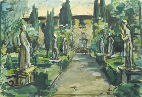 Enzo Pregno (Alessandria d'Egitto, 1898 - Firenze, 1972) Ingresso di villa, 1943 Tecnica mista su carta, cm. 51x74 Firma in basso a destra. € 245/345