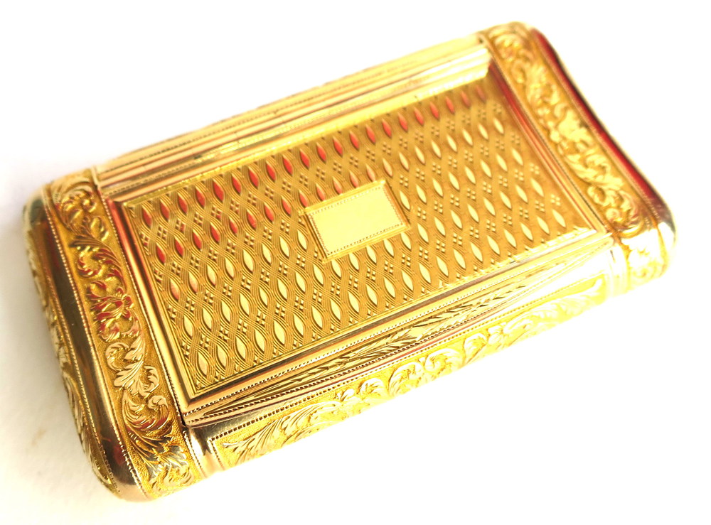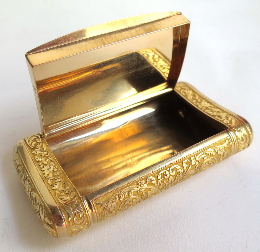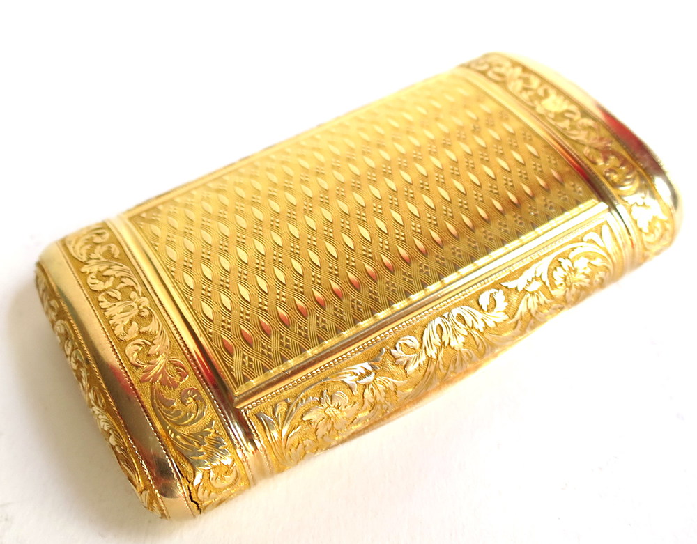 TABACCHIERA da tasca in oro giallo a corpo rettangolare leggermente arcuato, interamente cesellata e incica a motivi di palmette con girali. titolo dell'oro 750/000 Garanzia di Parigi 1819- 1838 cm 7,4 x 4,1 g . 39