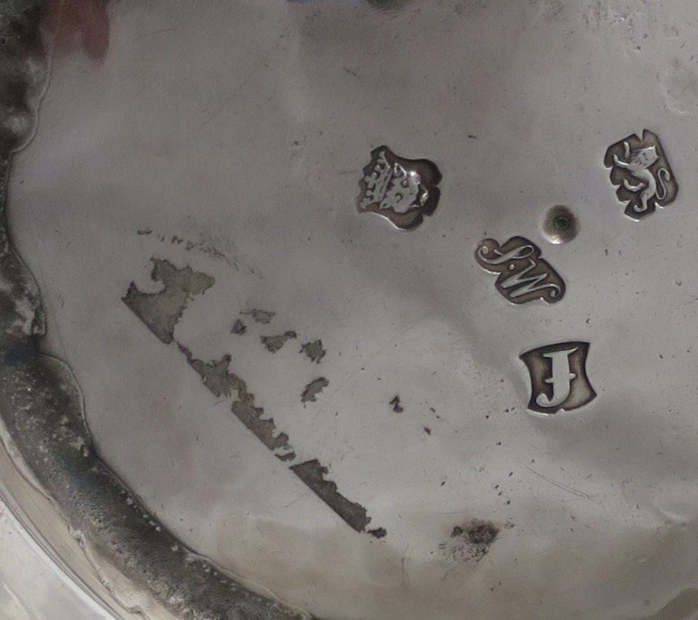 TANKARD in argento, corpo piriforme con nervatura centrale, coperchio incernierato, impugnatura a voluta. Londra 1741 argentiere Thos Whipham h: cm 22 g. 1010