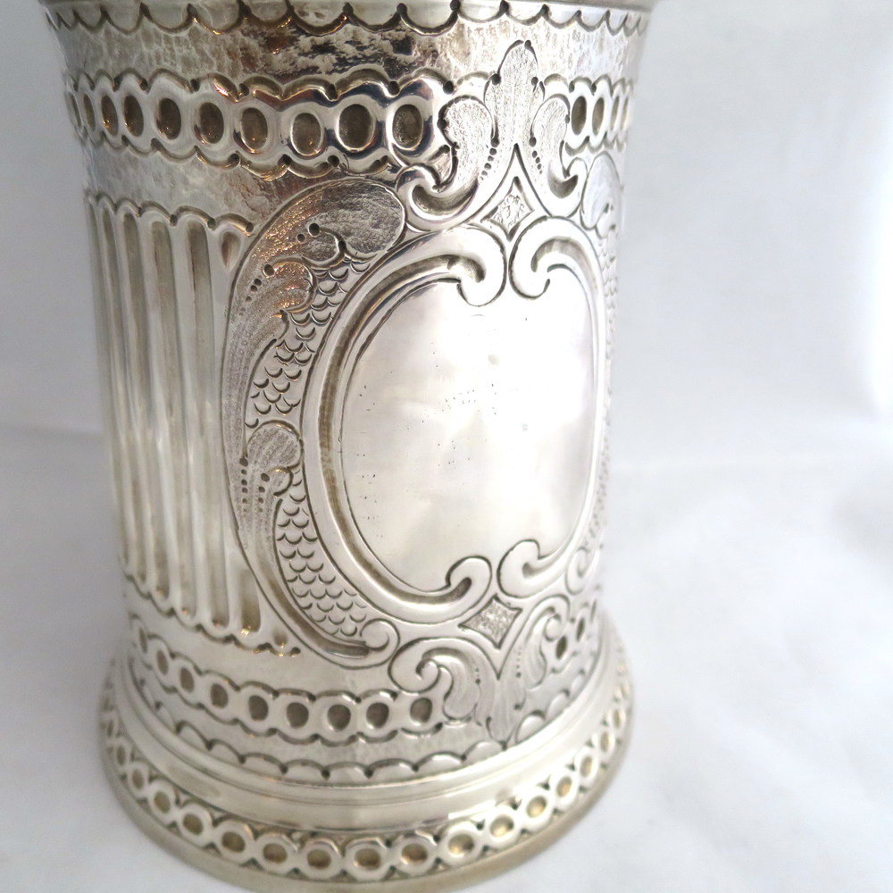 TANKARD in argento, corpo lavorato e costolato, al centro cartiglio lisco,...