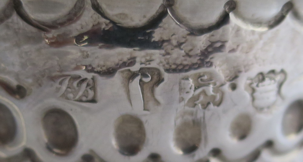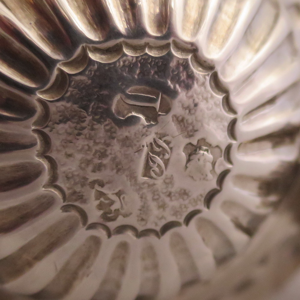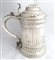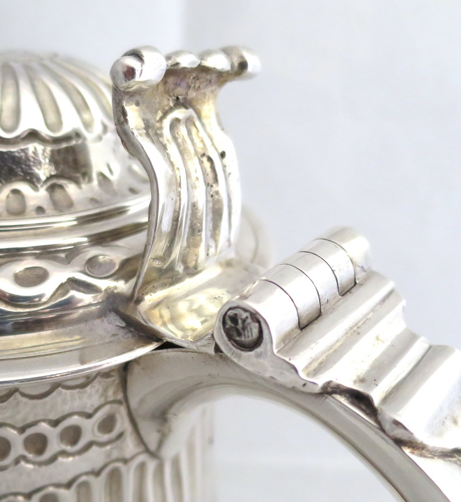 TANKARD in argento, corpo lavorato e costolato, al centro cartiglio lisco, coperchio incernierato, impugnatura a voluta. Londra 1753 argentiere John berthelot Difetti H: cm 20