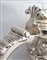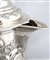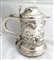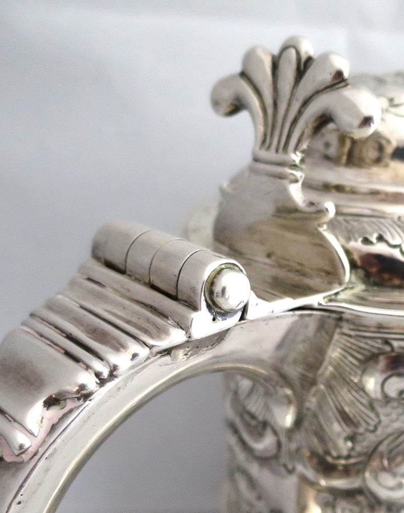 TANKARD in argento con versatoio. C orpo sbalzato a decori floreali, al centro cartiglio Coperchio incernierato e impugnatura a voluta. Dublino fine XVIII sec. argentiere William Clarke difetti h: cm 22 g. 1283