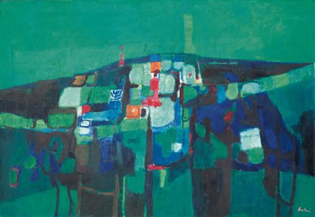 ENRICO PAULUCCI Genova 03/10/1901 - Torino 22/08/1999 - Paese sul mare, 1960, olio su tela cm. 100x145, firma in basso a destra, opera registrata presso l'Archivio Enrico Paulucci come da dichiarazione su foto.