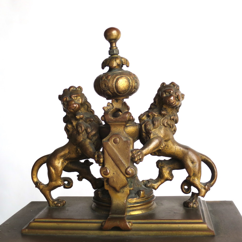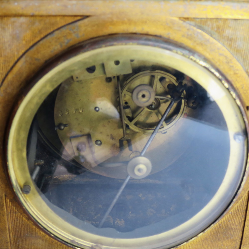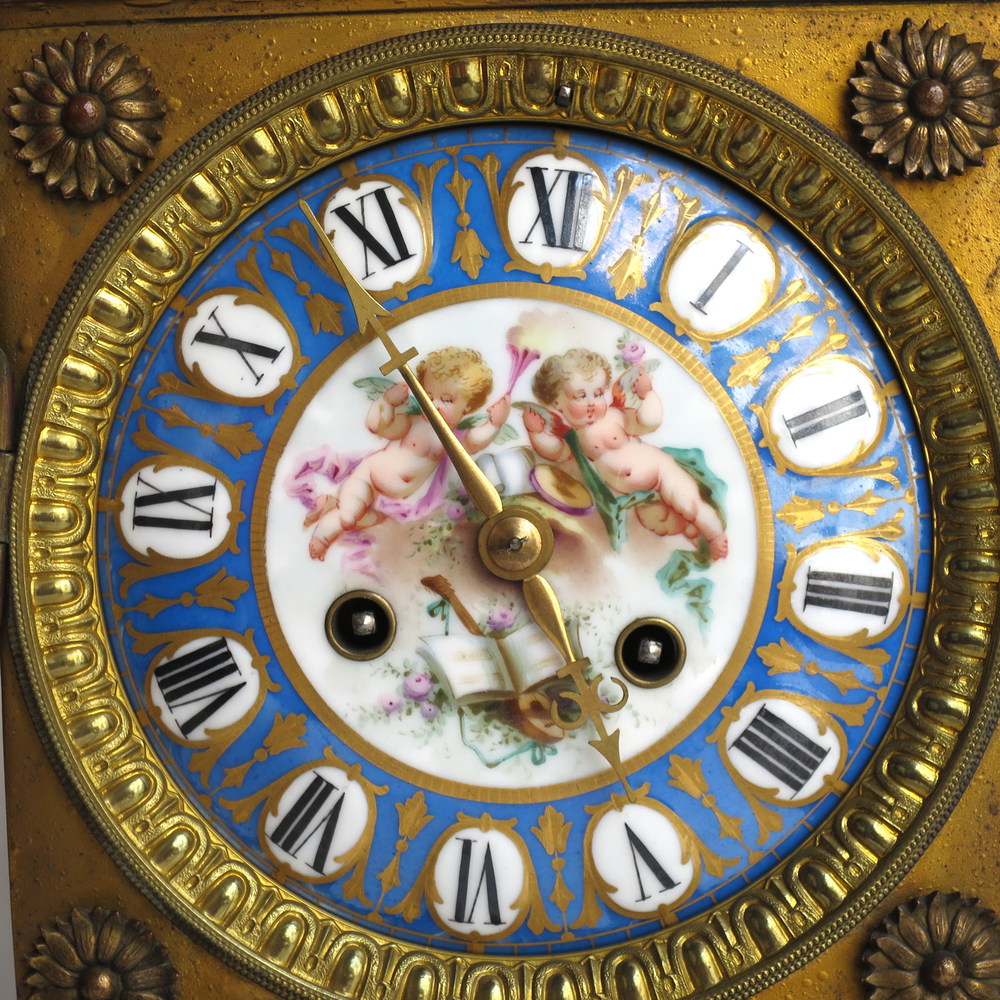 OROLOGIO da tavola in bronzo dorato. placche in porcellana dipinte. H: cm 44 Francia XIX sec. Difetti
