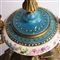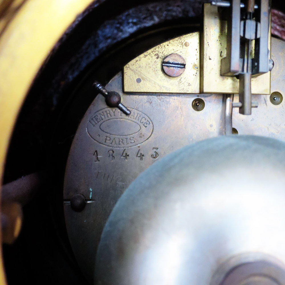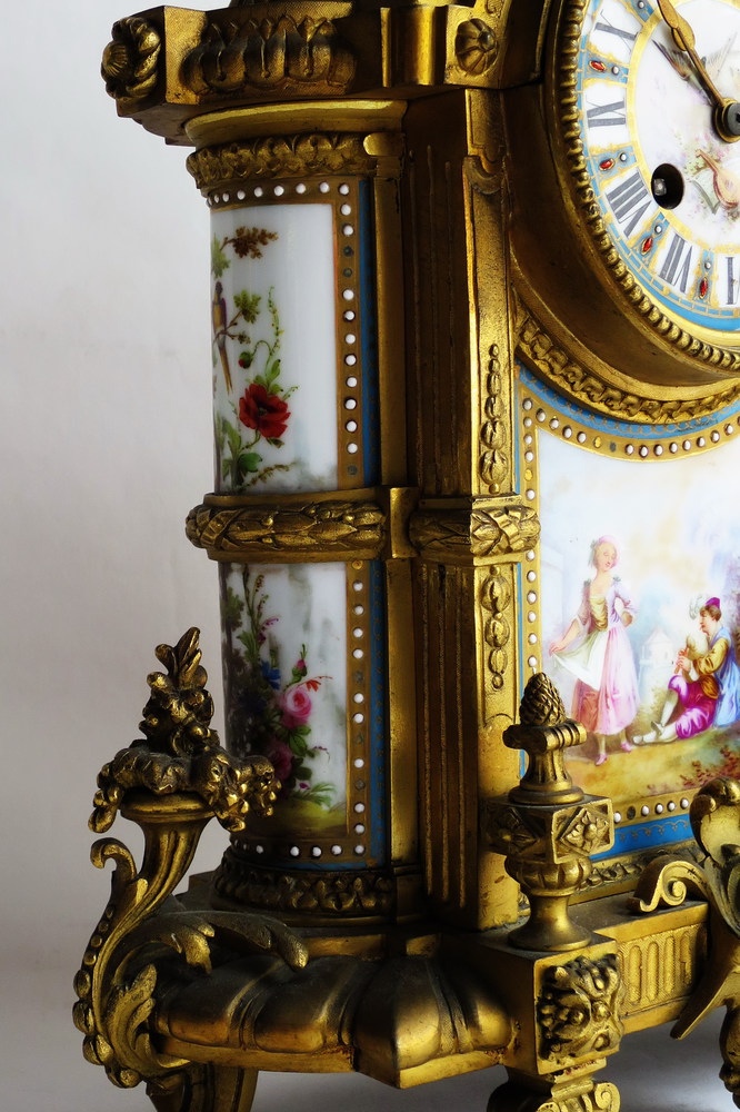 OROLOGIO da tavolo in bronzo dorato. Plache equadrante in porcellana dipinte....