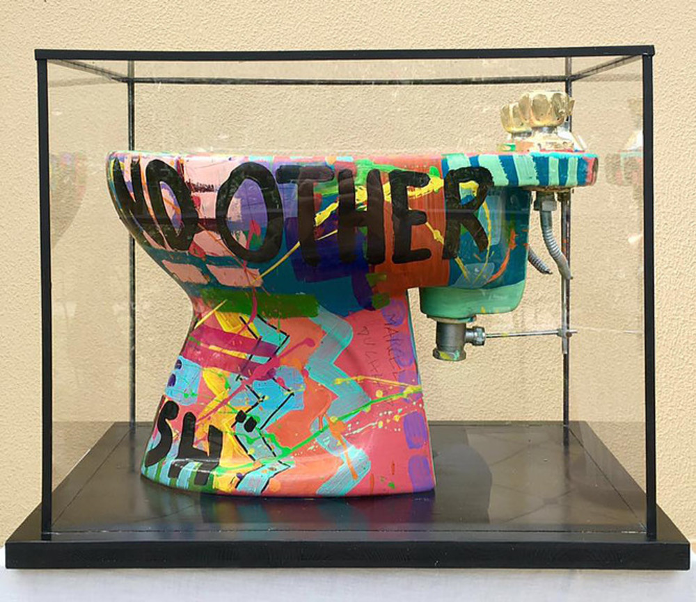 TOSH Bidet e acrilico "Wash ass and other" - sotto teca di plexiglass con colature di colore e scritta - cm 41 x 60 x 50.5