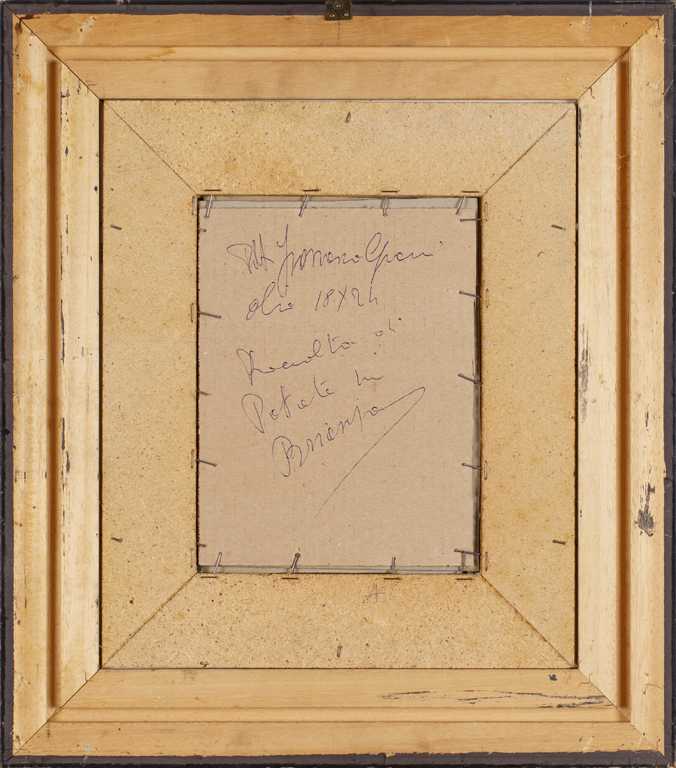 Firma, titolo, misure e tecnica al retro del cartone protettivo