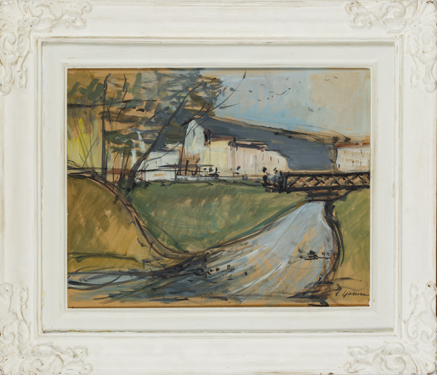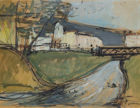 LUIGI SPAZZAPAN (1889-1958)Paesaggio con ponteTecnica mista su cartonecm...