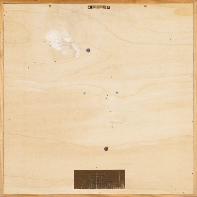 Bassorilievo in ottone (diametro 30 cm) su fondo in legno serigrafato a colori