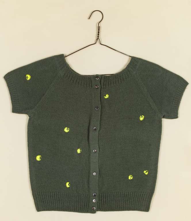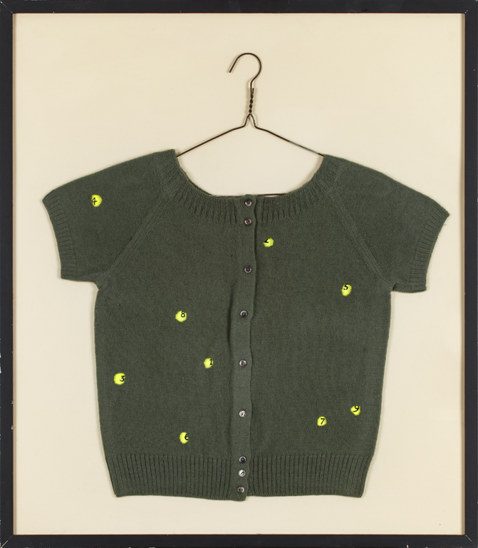 Firma e iscrizione 'Da esporre così come è appeso a un chiodo - Saluti Munari' su carta pinzata al retro del maglioncino