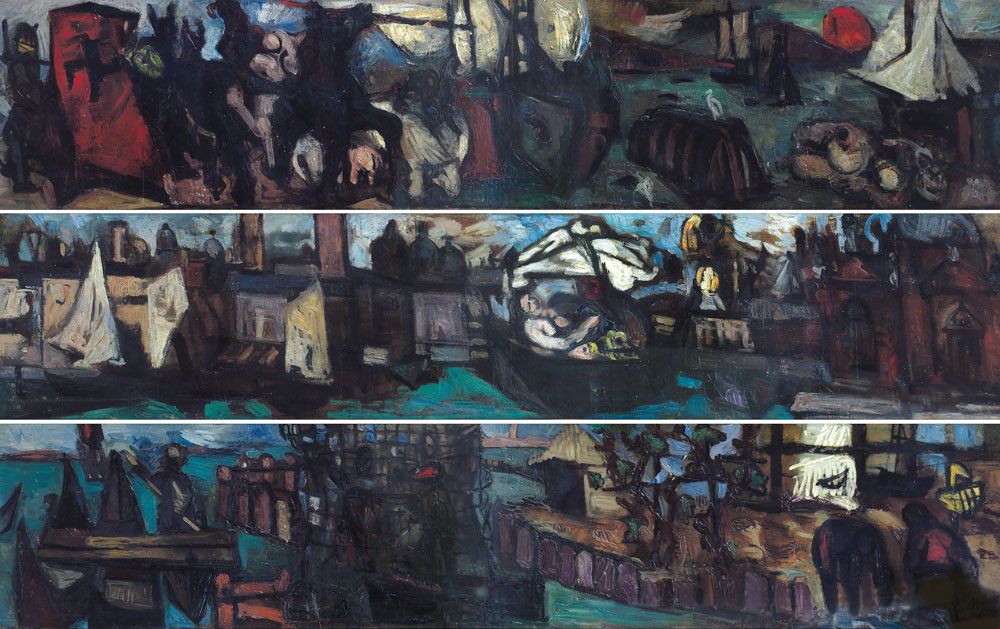 GIUSEPPE SANTOMASO Venezia 26/09/1907 - 24/05/1990 - Trittico dell'Angelo, 1946, olio su tre pannelli in tela rintelata cm. 49x237, 50x235 e 49x238, opera non firmata, pubblicato sul catalogo "Santomaso, omaggio a 20 anni dalla scomparsa", Edizioni Il Sogno di Polifilo, a cura di Franco Batacchi e Giovanni Granzotto, realizzato in occasione dela mostra dedicata a Giuseppe Santomaso organizzata nel 2010 dal 13 giugno al 19 luglio dalla Galleria Perl'A di Venezia con la partnership dello Studio d'Arte G.R., pagina 25 ed in copertina, pubblicato sul catalogo della mostra "Percorsi tra le biennali di Venezia 1948/1968, la pittura nuova in Friuli e a Venezia", a cura di Giovanni Granzotto, tenutasi presso il Parco Galleria d'Arte Moderna e Contemporanea Armando Pizzinato (PN) dal 27 marzo al 12 giugno 2011, pagina 49.
