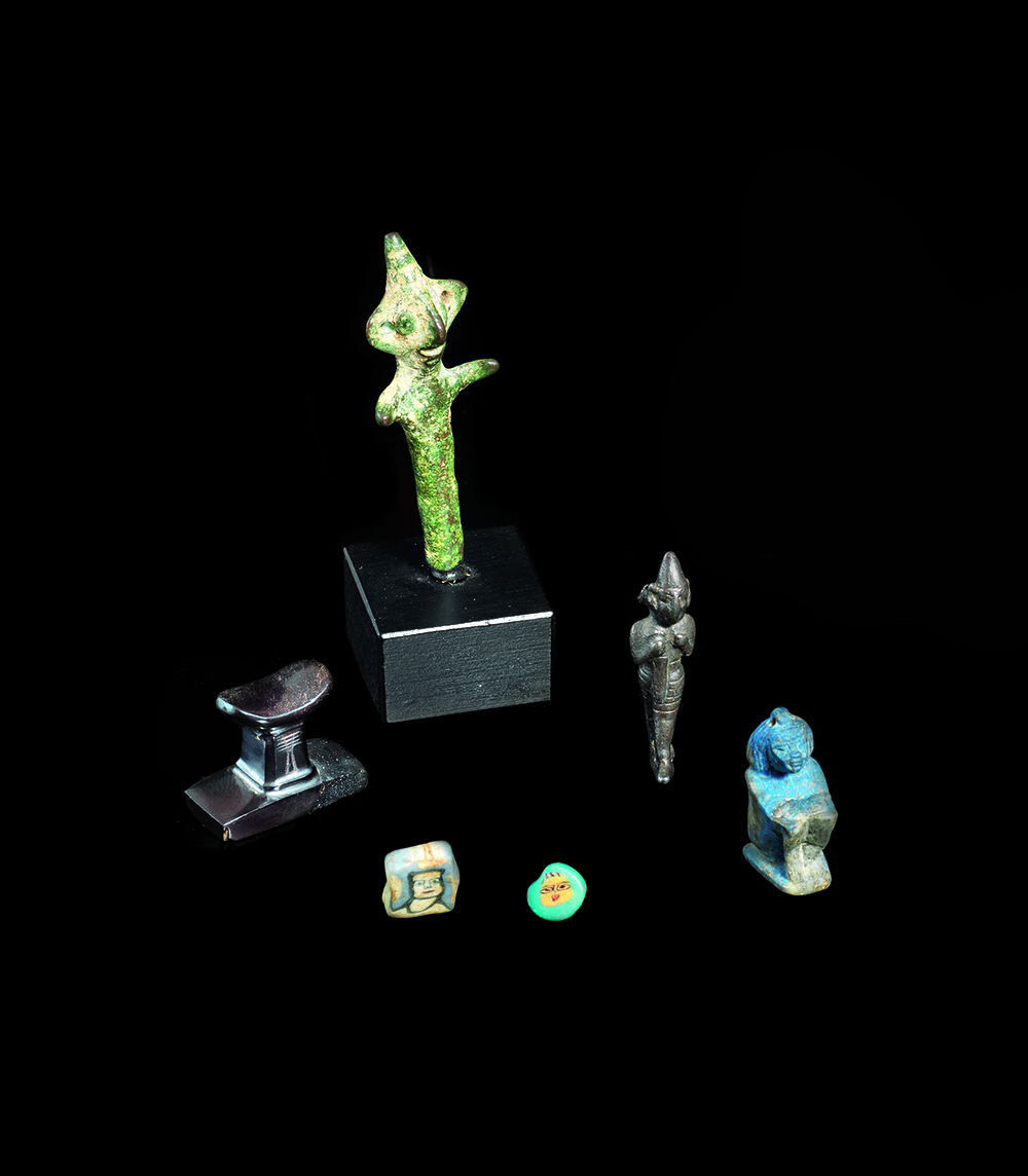 SEI AMULETI DATAZIONE: I millennio a. C. MATERIA E TECNICA: in bronzo, pietre dure e pasta vitrea Amuleto in foggia di poggiatesta in ematite con inciso il geroglifico del pilastro djed ad indicare stabilita` e quindi sonni tranquilli; uomo seduto con le braccia sulle gambe in lapislazzuli; due rari vaghi in pasta vitrea murrina con ritratti maschili a mosaico; due statuette in bronzo ra guranti un idolo stante con copricapo conico e braccia conserte sul petto e un idolo a gura umana stilizzata (6) PRODUZIONE: cultura egiziana e cananea STATO DI CONSERVAZIONE: integri DIMENSIONI: alt. da cm 0,5 a cm 8 PROVENIENZA: Galerie Nefer, Zurigo; J. Billen, Bruxelles; Charles Ede, London; Hadji Baba Ancient Art Ltd, London;