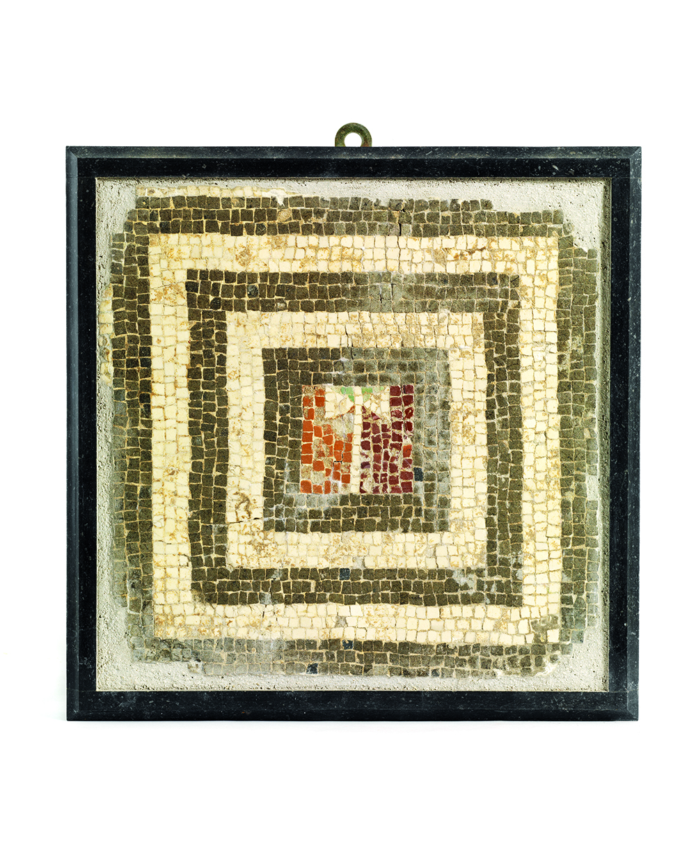 MOSAICO DATAZIONE: I sec. a. C. MATERIA E TECNICA: tessere in calcare bianco, grigio e rossiccio Frammento di mosaico formato da fasce concentriche alternate in bianco e nero e centrate da emblema costituito da un’ascia bipenne con lungo manico in campo rosso, entro cornice moderna STATO DI CONSERVAZIONE: lacunoso su tutti i lati PRODUZIONE: cultura romana tardo repubblicana DIMENSIONI: cm 31x31