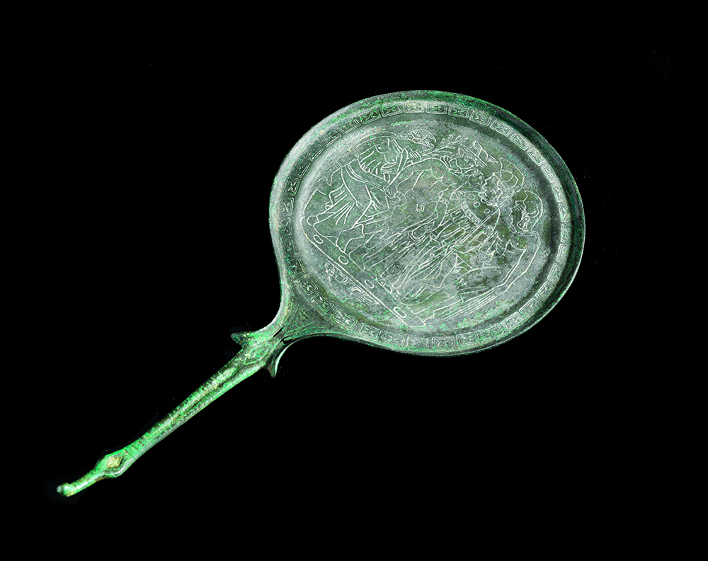 SPECCHIO ETRUSCO DATAZIONE: IV-III sec. a. C. MATERIA E TECNICA: bronzo fuso, decorazione a incisione Specchio a disco con manico a verga sagomato, desinente con testa ferina stilizzata DECORAZIONE: eseguita dalla parte non riflettente. All’interno dello spazio circolare si trova una composizione di quattro figure; da sinistra Apollo, rivolto a sinistra, assiso e panneggiato con corona di alloro nei capelli e ramo di alloro nella mano sinistra; accanto segue Mercurio nudo, volto a sinistra, con petaso sulla testa e calzari ai piedi, e mantello annodato sotto la gola; in piedi alla sua sinistra Minerva, volta a destra, con elmo crestato e lunga lancia, chiude il gruppo Marte, orientato a destra, nudo , con elmo e mantello annodato, appoggiato ad un basamento e la gamba destra sollevata PRODUZIONE: Etruria meridionale STATO DI CONSERVAZIONE: integro, ossidato DIMENSIONI: lungh. cm 25,6; diam. cm 14 BIBL: D. Rebuffat-Emanuel Le miroir étrusques d’apre's la Collection du Cabinet des Médailles, Roma 1973