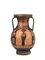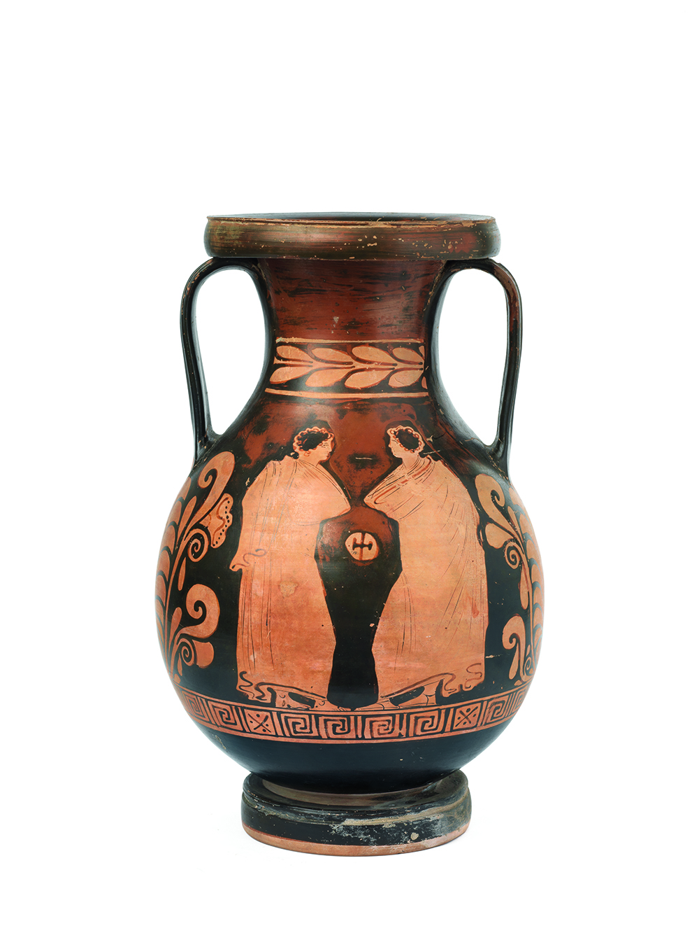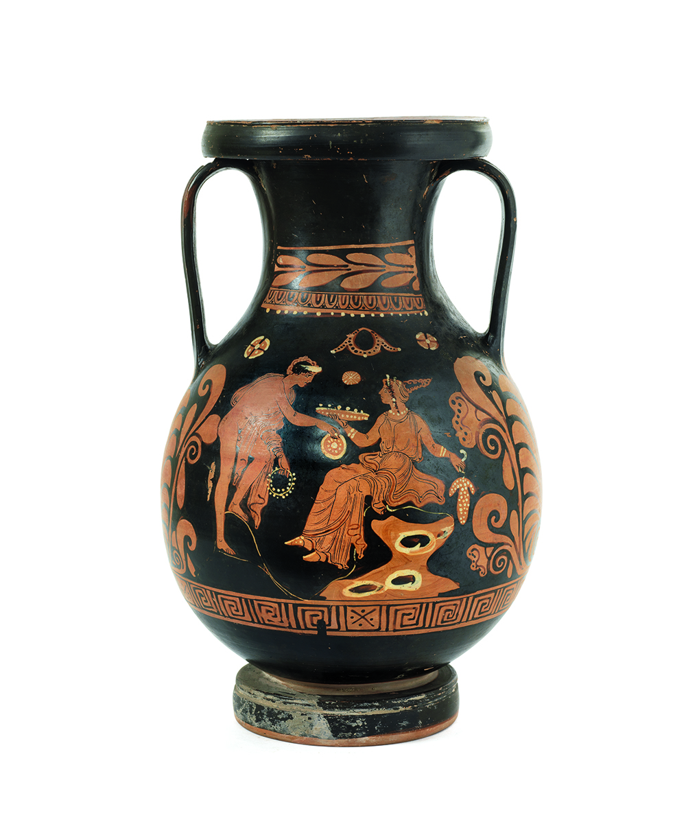PELIKE APULA A FIGURE ROSSE DATAZIONE: 340-33 a. C. MATERIA E TECNICA: argilla figulina camoscio, vernice nera lucente, suddipinture in bianco e giallo, coloritura arancio, modellata a tornio veloce Labbro estroflesso con orlo modanato, alto collo a profilo concavo, indistinto dal corpo ovoide, anse a nastro impostate verticalmente dal collo alla spalla, piede ad echino modanato DECORAZIONE ACCESSORIA: interamente verniciata ad eccezione della parte inferiore all’attacco del piede; sopra le scene figurate tralcio di olivo orizzontale e kyma ionico, sotto alle scene figurate meandro destrorso interrotto da motivo a croce di Sant’Andrea; sotto le anse grande palmetta aperta a ventaglio fra volute ed infiorescenze DECORAZIONE: lato A) una giovane donna, seduta su un masso e volta a destra, tiene nella mano destra una grande patera e nella sinistra un grappolo d’uva. La giovane e` vestita con chitone plissettato fermato sulle spalle e in vita da una cintura ed ha i capelli acconciati con il kekriphalos; il ricco abbigliamento e` completato dalla stephane radiata sulla fronte, orecchini, armille, collana e calzari; di fronte a lei un efebo, nudo, con tenia nei capelli ricciuti, il piede sinistro su un masso, col mantello drappeggiato sulle spalle e` curvo verso la giovane in atto di o rilrle una patera ed una ghirlanda; nel campo riempitivi a rosette ed una tenia ricamata. Lato B) scena di conversazione: due giovani uomini a rontati, completamente ammantati in un lungo himation, nel campo una coppia di halteres evoca l’ambiente della palestra PRODUZIONE: ceramica apula a figure rosse, pittore di Laodamia STATO DI CONSERVAZIONE: integra DIMENSIONI: alt. cm 37; diam. bocca cm 17 CFR.: A. D.Trendall, A. Cambitoglou, The Red-figured Vases of Apulia II, Oxford 1982, pl. 172
