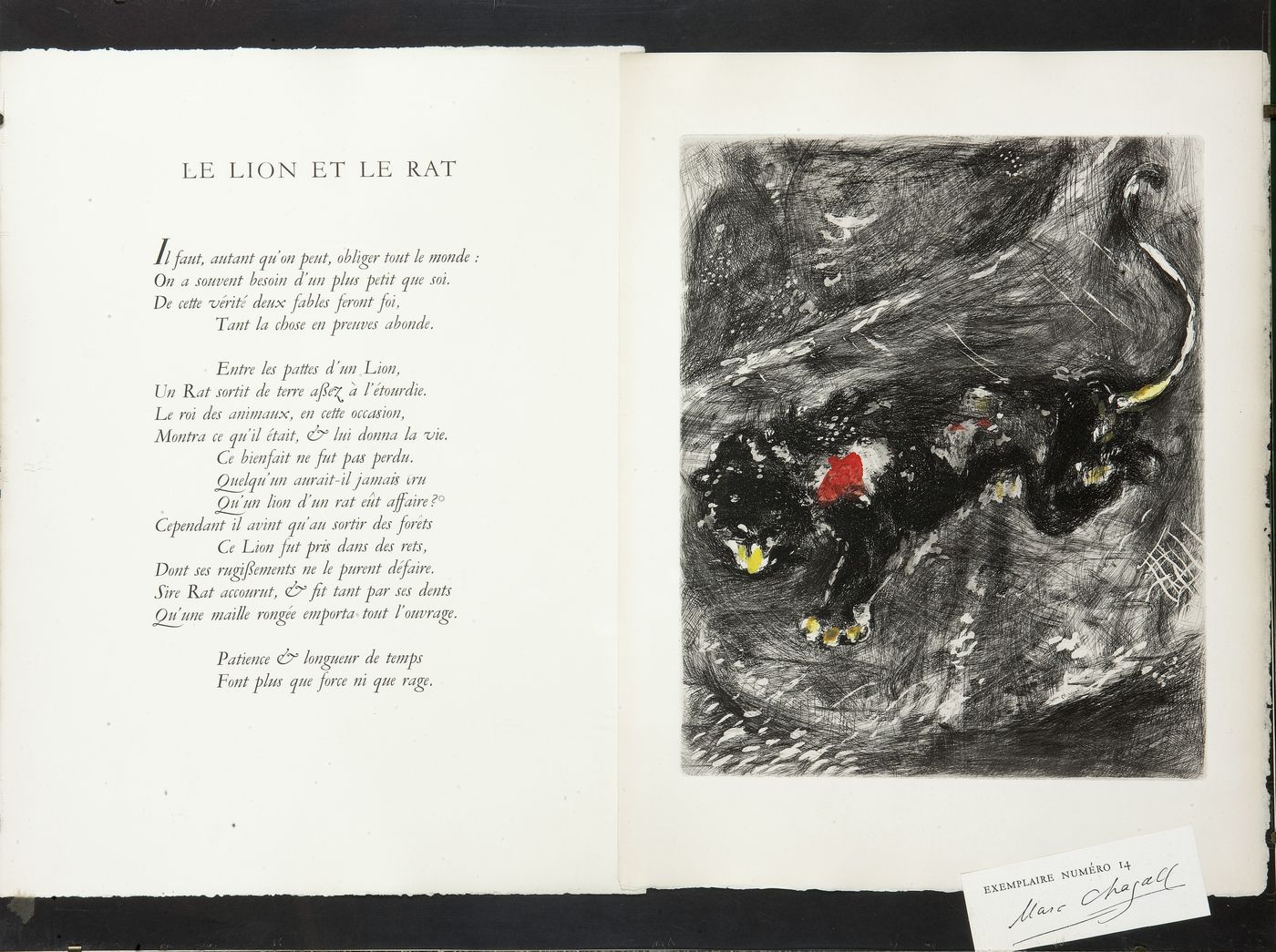 CHAGALL MARC Vitebsk (URSS) 1887 - 1985 Saint-Paul de Vence (F) "Le lion et le rat" 39x30 (foglio), 30x24 (inc.), acquaforte originale colorata a mano dall'artista, es. 14/85 Opera firmata in basso a destra Acquaforte originale firmata sulla lastra e colorata a mano dall'artista Suite di 100 illustrazioni per le Fables di La Fontaine, incise tra il 1928 e il 1930, pubblicate a Parigi nel 1952 Esemplare n. 14 degli 85 colorati a mano dall'artista, su una tiratura complessiva di 200 esemplari. Stupenda tavola dai colori vivaci e surreali che spiccano dall'accentuato chiaroscuro dell'acquaforte, evidenziandone alcuni elementi narrativi. Opera presentata insieme al testo della Fable.