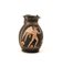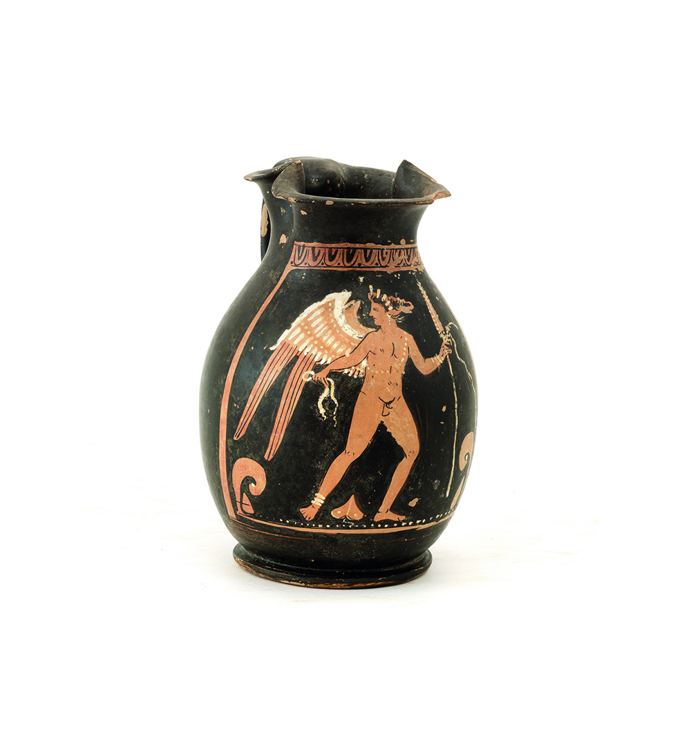 OINOCHOE APULA A FIGURE ROSSE DATAZIONE: metà IV sec. a. C. MATERIA E TECNICA: argilla camoscio, vernice nera lucente; suddipinture in bianco e giallo e paonazzo, coloritura rosso arancio, modellata a tornio veloce Bocca trilobata pronunciata da due apicature con labbro rovesciato all’esterno e scanalato, alto collo a profilo concavo, distinto corpo ovoidale, ansa a nastro con duplice costolatura, sormontante, impostata verticalmente dal labbro alla spalla; piede a disco DECORAZIONE ACCESSORIA: interamente verniciata in nero; sul collo kyma ionico, sotto l’ansa palmetta aperta a ventaglio fra girali, volute e infiorescenze, bordo del piede verniciato DECORAZIONE: grande figura di erote androgino e nudo gradiente a sinistra e retrospiciente; il giovane è raffigurato con grandi ali variopinte sollevate, stephane radiata nei capelli, orecchini pendenti, collane al collo e a balteo sul torace, armille ai polsi e alle caviglie, in atto di sostenere un tirso nella mano destra ed una tenia nell’altra; nel campo un una foglia d’edera cuoriforme PRODUZIONE: ceramica apula a figure rosse STATO DI CONSERVAZIONE: integra DIMENSIONI: alt. cm 25 BIBL: A.D. Trendall, A. Cambitoglou The Red-figured Vases of Apulia, Supplemento II, London 1991