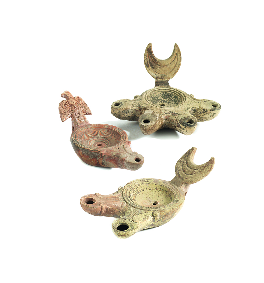 TRE LUCERNE FITTILI DATAZIONE: II-III sec. d. C. MATERIA E TECNICA: argilla rosata e rossastra, vernice rossa, modellate a stampo Due lucerne una bilicne ed una quadrilicne con becchi a volute, terminanti ad angolo ottuso, ansa sopraelevata plastica a forma di crescente lunare; lucerna monolicne con becco a volute, terminante ad angolo ottuso, ansa sopraelevata plastica a forma d’aquila, disco decorato a baccellatura (3) PRODUZIONE: ceramica africana STATO DI CONSERVAZIONE: una integra, le altre due con lievi restauri DIMENSIONI: alt. cm. 5,5, cm 6,5, cm 8,5, cm 13, cm 16, cm 17 e 9,5