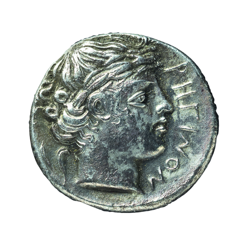 BRUTTIUM TETRADRACMA REGGIO DATAZIONE: 415-387 a. C. MATERIA E TECNICA: argento coniato D: testa di leone frontale accuratamente delineata, entro cornice perlinata R: testa laureata di Apollo giovinetto a destra; a sinistra ramoscello d’olivo; iscrizione RHGINON PRODUZIONE: cultura magno greca STATO DI CONSERVAZIONE: splendido DIMENSIONI: diam mm 24, peso gr. 16,12 PROVENIENZA: Solidus Numismatik e. K., Mu¨nchen