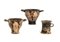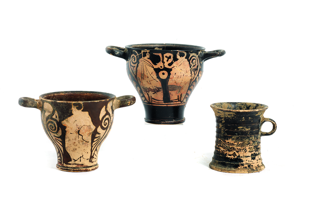 DUE SKYPHOI CAMPANI E UNA TAZZA DATAZIONE: fine IV sec. a. C. MATERIA E TECNICA: argilla figulina rosata, vernice nera lucente, modellati a tornio veloce Due skyphoi con labbro appena estroflesso con orlo arrotondato, corpo ovoide rastremato verso il basso, piede ad anello, anse a nastro impostate orizzontalmente sotto l’orlo; tazza con corpo a rocchetto decorato da nerbìvature orizzontali, ansa ad anello impostata a due terzi del corpo (3) DECORAZIONE: su entrambi i lati figure maschili completamente avvolte nei mantelli, in un caso affrontate con strigile e halteres, sotto le anse palmette aperte e volute STATO DI CONSERVAZIONE: integralmente ricomposti da frammenti PRODUZIONE: ceramica campana a figure rosse DIMENSIONI: alt. cm 12, cm 10, cm 9