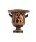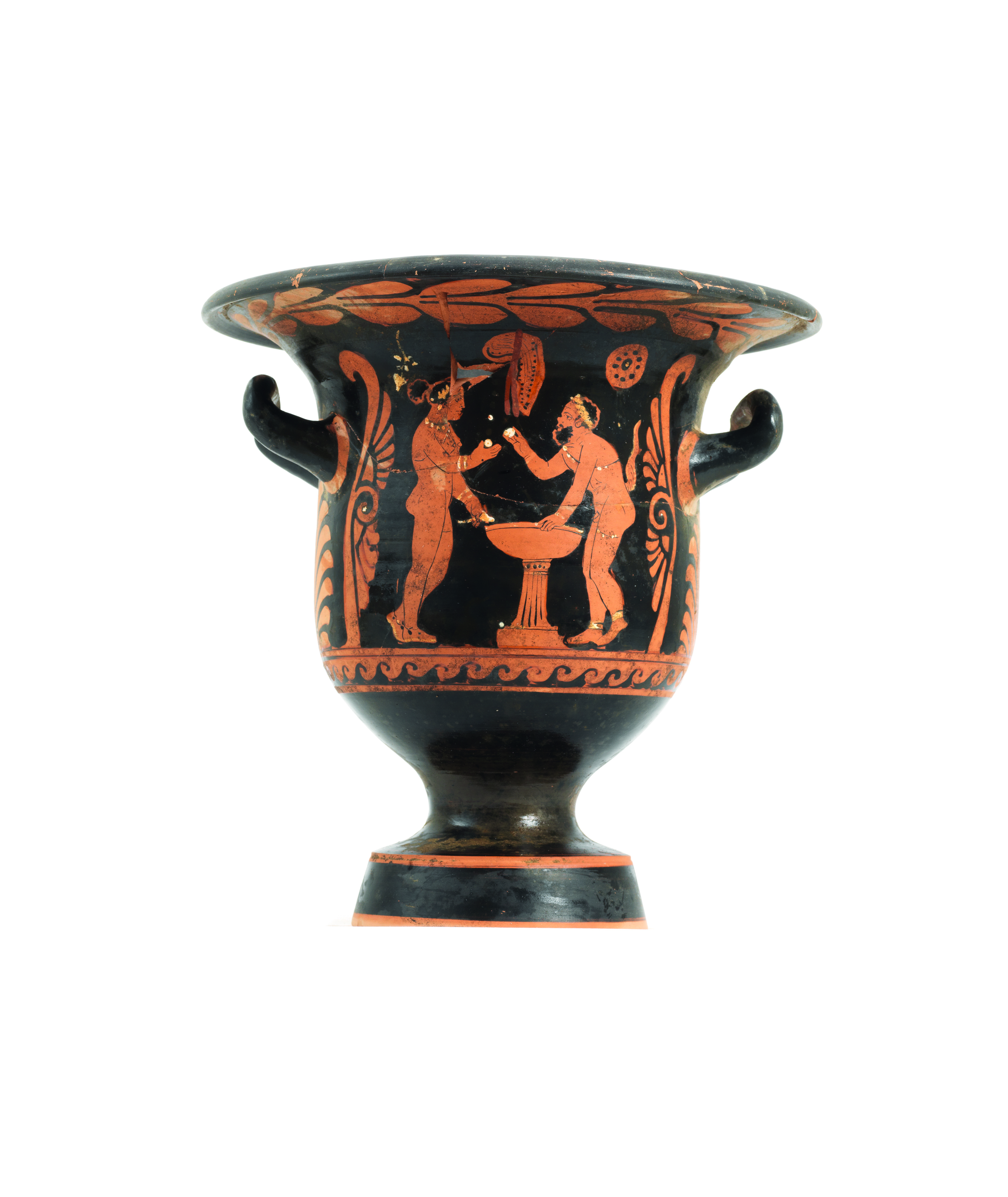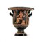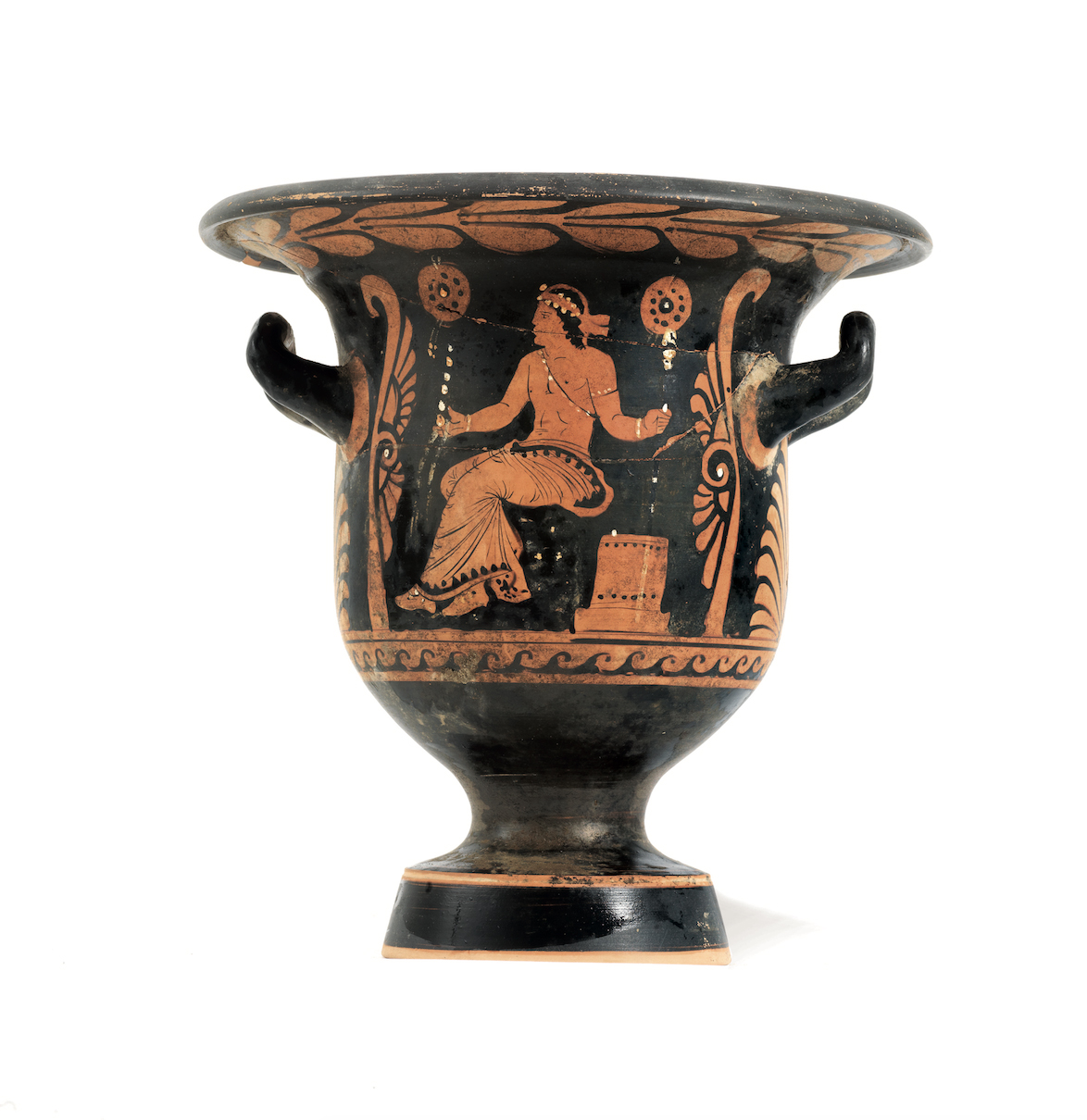 CRATERE A CAMPANA CAMPANO DATAZIONE: fine IV sec. a. C. MATERIA E TECNICA: argilla figulina camoscio, vernice nera, coloritura arancio, suddipinture in bianco e giallo; modellato a tornio veloce Labbro estroflesso distinto con orlo arrotondato, corpo campaniforme, anse a bastoncello, impostate orizzontalmente e ritorte verso l’alto; piede a echino modanato DECORAZIONE ACCESSORIA: sotto il labbro tralcio orizzontale di foglie di olivo; sotto le anse grande palmetta, aperta a cuore fra girali e volute, spazio fra le anse risparmiato, falsa baccellatura all’attacco dell’ansa; sotto le due scene figurate meandro ad onda destrorso DECORAZIONE: lato A) erote androgino nudo e stante di profilo a sinistra, con capelli raccolti in una crocchia, stephane radiata, orecchini, collana armille e calzari con un uovo nella mano destra sollevata, di fronte a lui una piccola fontana su colonnetta scanalata alla quale si appoggia con la mano sinistra un satiro, nudo e barbato con la coda sollevata con corona d’edera fra i capelli, collane a balteo sul torace ed alla coscia sinistra e armille a polsi e caviglie; nella mano tiene anch’egli un uovo; nel campo una stoffa ricamata ed un cembalo; lato B) Dioniso assiso a destra di tre quarti su una pila di sassi a torace nudo, con le gambe coperte da un mantello ricamato; il dio ha una corona d’edera fra i capelli, collana di perle a balteo sul torace ed all’avambraccio, armille ai polsi e calzari; tiene in ciascuna mano un lungo tirso fiorito; dietro a lui una piccola ara STATO DI CONSERVAZIONE: ricomposto da frammenti PRODUZIONE: ceramica campana a figure rosse DIMENSIONI: alt. cm 33; diam. bocca cm 33 CFR.: A.D.Trendall, Red-figured Vases of South Italy and Sicily, London 1989, p.198-200, n. 342-345