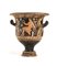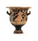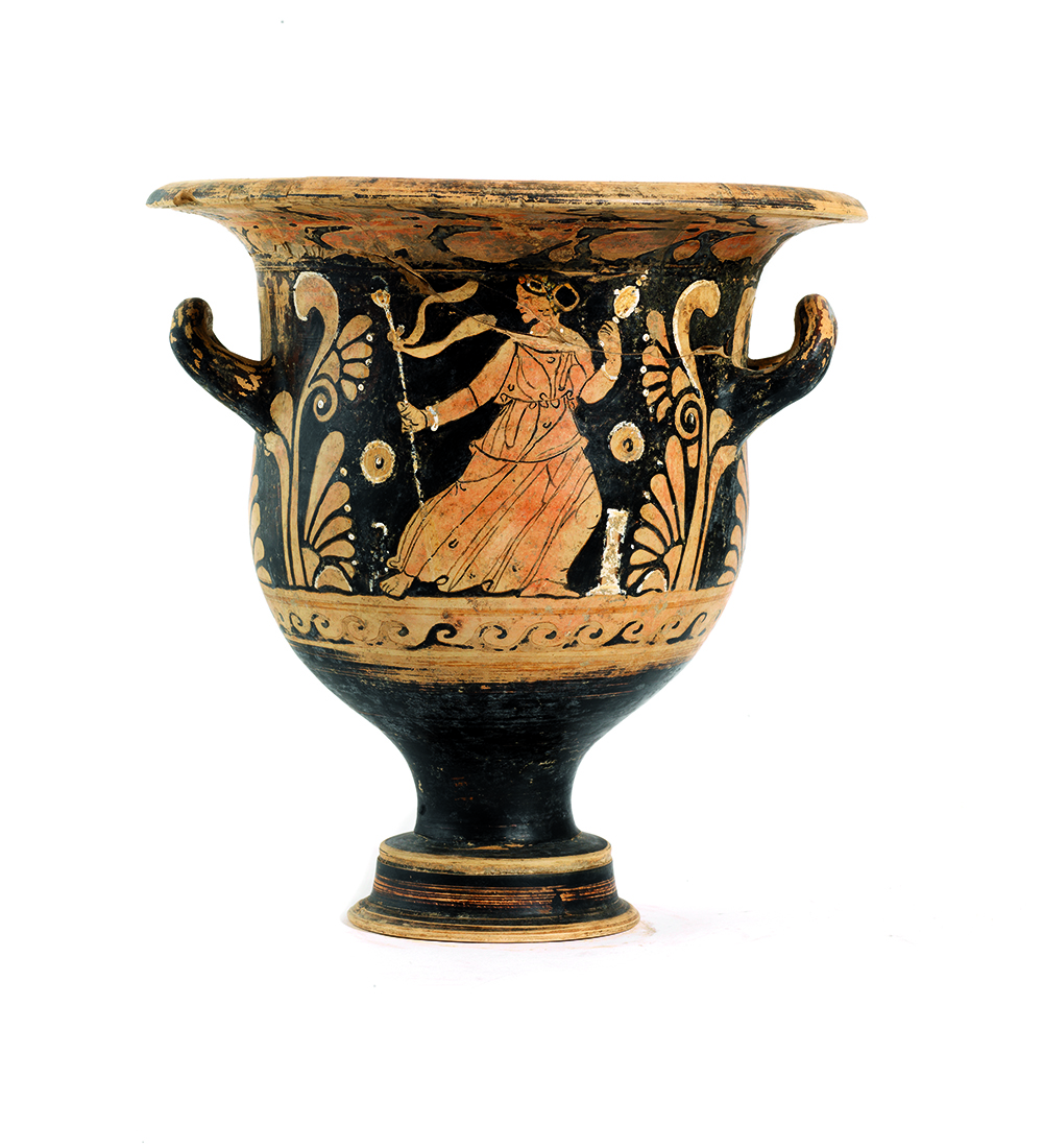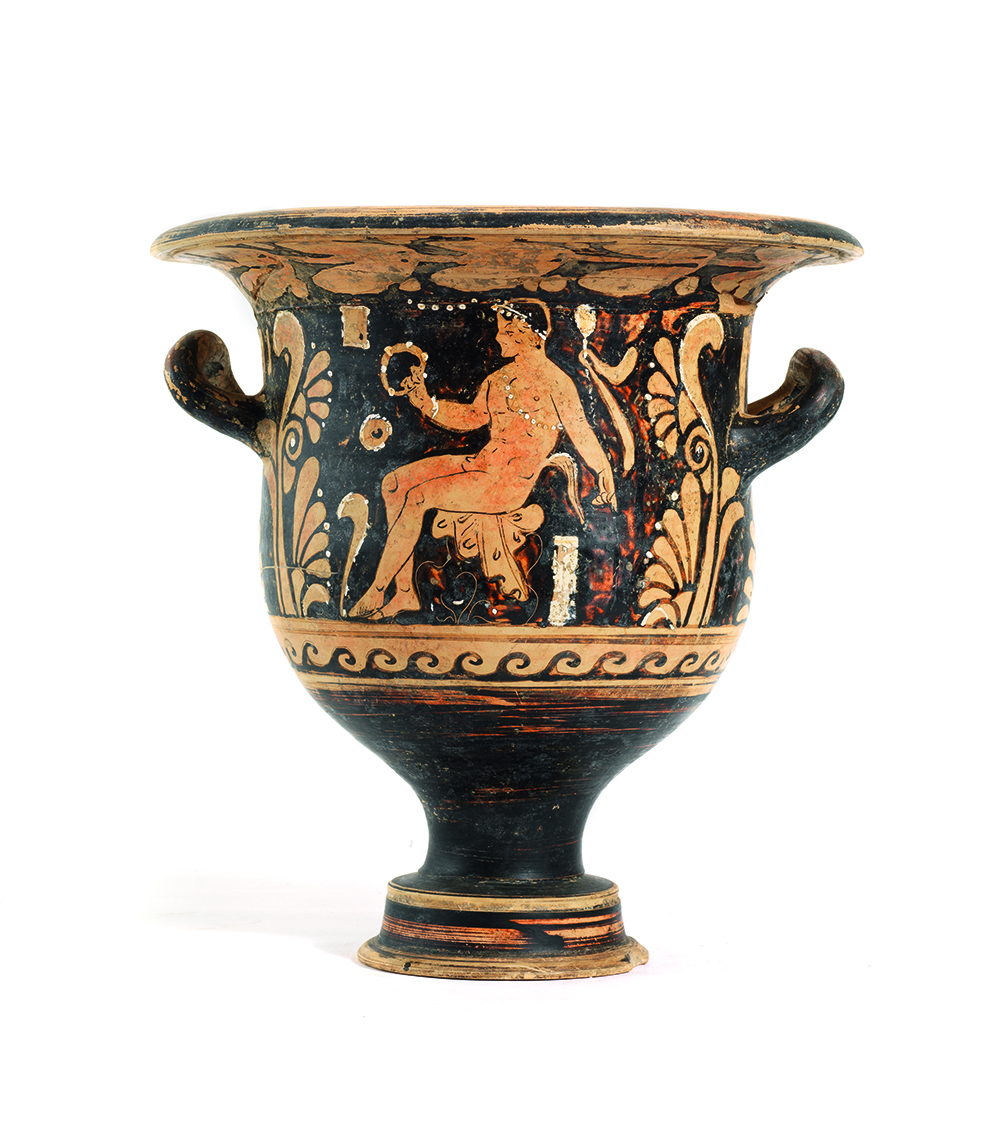 CRATERE A CAMPANA CAMPANO DATAZIONE: fine IV sec. a. C. MATERIA E TECNICA: argilla figulina camoscio, vernice nera lucente, suddipinture in bianco e giallo, coloritura arancio; modellato a tornio veloce Labbro estroflesso distinto, con orlo arrotondato, corpo campaniforme, anse a bastoncello, impostate orizzontalmente e ritorte verso l’alto; piede a echino modanato DECORAZIONE ACCESSORIA: sotto il labbro tralcio orizzontale di foglie di olivo; sotto le anse palmetta aperta a ventaglio fra girali e volute, spazio fra le anse risparmiato; sotto le due scene figurate meandro ad onda destrorso DECORAZIONE: lato A) giovane satiro nudo seduto a destra su una pila di sassi, in atto di sollevare con la mano destra un cembalo e di sostenere una situla nell’altra; il giovane porta su i capelli un tralcio fiorito , una collana di perle di traverso sul torace ed armille ai polsi; lato B) menade in corsa verso destra e retrospiciente, la donna veste un chitone plissettato e fermato in vita da una cintura le cui pieghe si aprono a sottolineare il movimento delle gambe, tiene nella mano destra un tirso e nella sinistra uno specchio, a terra una piccola ara STATO DI CONSERVAZIONE: ricomposto da frammenti PRODUZIONE: ceramica campana a figure rosse DIMENSIONI: alt. cm 33,5; diam. bocca cm 31