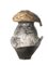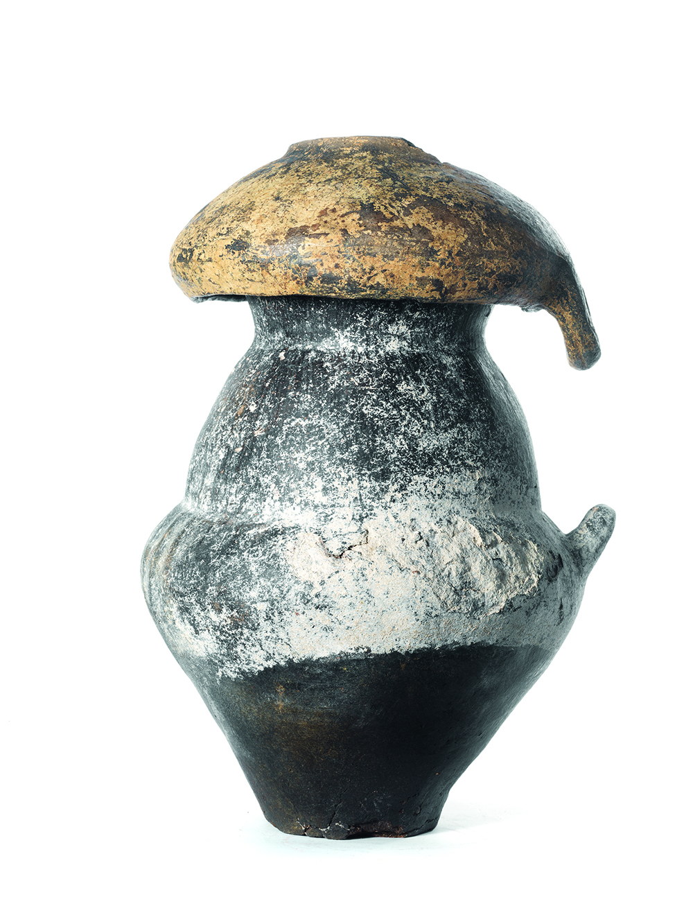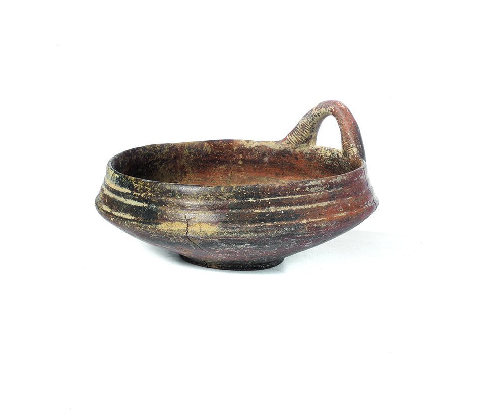 CINERARIO BICONICO CON COPERCHIO DATAZIONE: fine IX, inizi VIII sec. a. C. MATERIA E TECNICA: impasto rossiccio con ingubbiatura nerastra, lucidato a stecca, decorazione ad impressione; modellato a mano Cinerario con ampio orlo svasato, forma biconica con spalla arrotondata decorata solcature verticali, fondo piatto; ansa a bastoncello, impostata obliquamente sulla massima espansione del corpo; ciotola-coperchio in impasto nero lucidato a stecca, labbro rientrante, vasca carenata, piede a disco, ansa a bastoncello verticale sull’orlo; altra ciotola-coperchio in impasto bruno lucidato a stecca, labbro rientrante decorato da tre solcature, vasca carenata, piede a disco, ansa a bastoncello verticale sull’orlo (3) PRODUZIONE: ceramica etrusca meridionale STATO DI CONSERVAZIONE: biconico integro con incrinature, coperchio lacunoso, incrostazioni; altra ciotola-coperchio ricomposta da frammenti DIMENSIONI: alt. cm 40; diam. bocca. cm 21 PROVENIENZA: Casa d’Aste Pandolfini, Firenze Ciotola-coperchio non pertinente