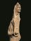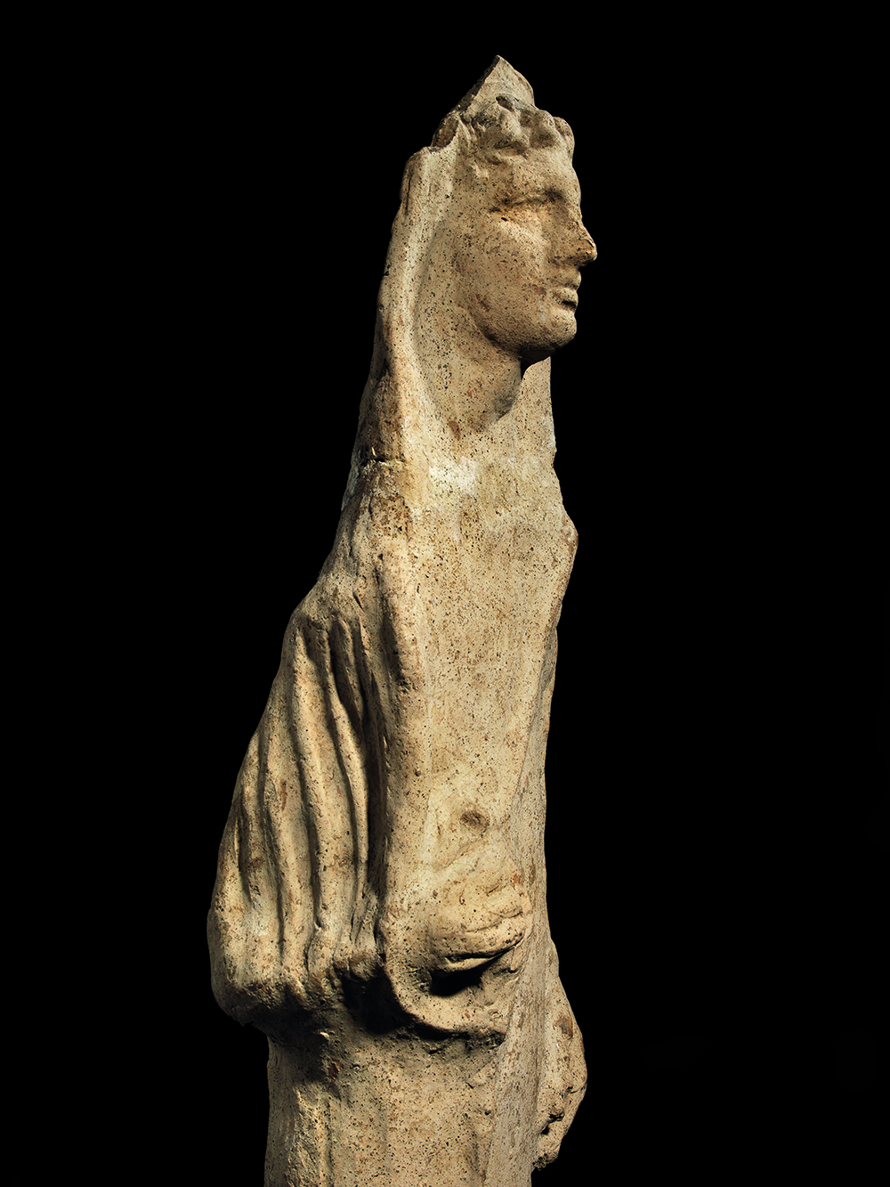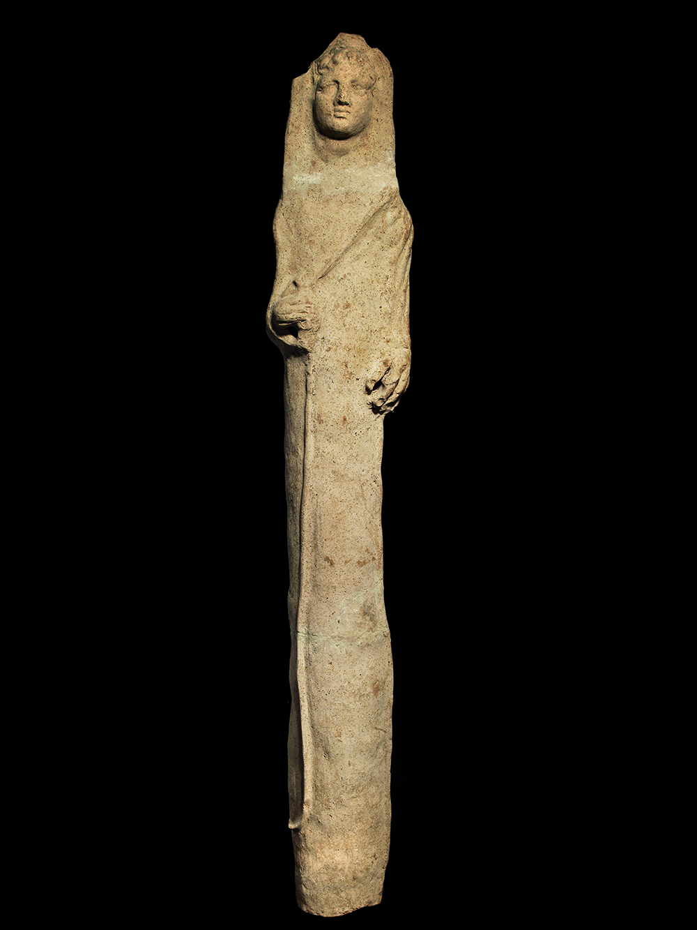 RARISSIMO EX VOTO TUBOLARE DATAZIONE: III sec. a. C. MATERIA E TECNICA: argilla depurata rosata, modellato a stampo e a mano, rifiniture a stecca, modellato solo nella parte anteriore Questo oggetto, rarissimo nel suo genere, rappresenta un offerente stilizzato, con la forma particolarmente allungata della figura. Indossa un mantello che gli copre la testa e avvolge tutta la figura, scendendo fino a terra e dal quale fuoriescono solo le mani. Il braccio destro è flesso al gomito e la mano appoggiata sul ventre, l’altro braccio è disteso lungo il fianco. Nelle mani dovevano essere presenti una ghirlanda ed una patera in altro materiale. La classe degli ex voto costituisce una produzione importante in Etruria meridionale, dove famiglie di artigiani si spostavano in continuazione nelle zone sacre in occasione delle varie festività. Essi costruivano un vero e proprio laboratorio con forno per cuocere i manufatti in argilla. Questi artisti producevano ex voto utilizzando stampi in terracotta (il volto) che spesso a causa dell’uso si deterioravano e venivano sostituiti. Tale processo naturalmente produceva ex voto sempre più piccoli a causa del ritiro dell’argilla sia del nuovo stampo che del prodotto finito. Le matrici di questi oggetti straordinari erano un vero e proprio patrimonio della famiglia di artigiani nomadi (mani, piedi, visceri, volti, braccia, gambe). I manufatti finiti erano successivamente raccolti in pozzi sacri, i bodroi, ed ivi conservati vicino al tempio. La fattura delicata del volto rivela influenze ellenistiche ed è inquadrabile nelle tarde produzioni di inizio del III secolo a.C. nell’Etruria meridionale. L’ex voto in esame fa parte di una rara categoria che ispirò il lavoro di vari artisti in epoca moderna, primo fra tutti quello dello scultore ticinese Giacometti con le produzioni bronzee delle cosiddette ‘ombre della sera’. La scultura tubolare ricorda le figure aniconiche di Cirene, colonia greca del nord-Africa, rappresentanti colonne in pietra e marmo, prive di volto ma con capigliatura (Persefone), memoria dei tubi posti sui tumuli tombali, che consentivano di far raggiungere l’offerta del sangue sacrificale all’interno della tomba e liberare l’anima del defunto, accompagnandolo nell’aldilà. PRODUZIONE: ceramica etrusco-laziale STATO DI CONSERVAZIONE: ricomposta da frammenti DIMENSIONI: alt. cm 140
