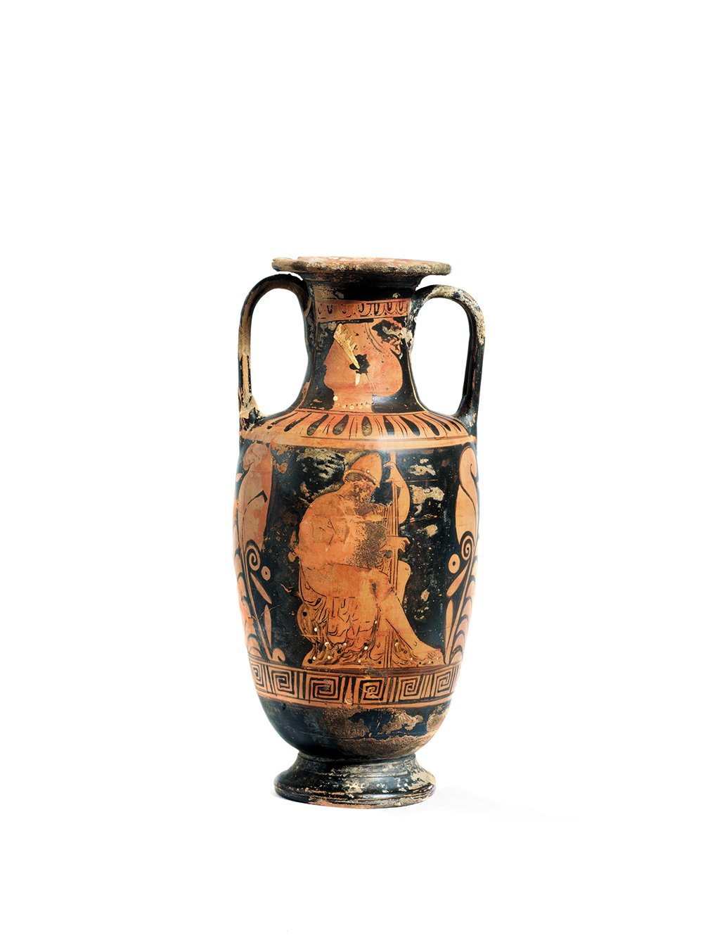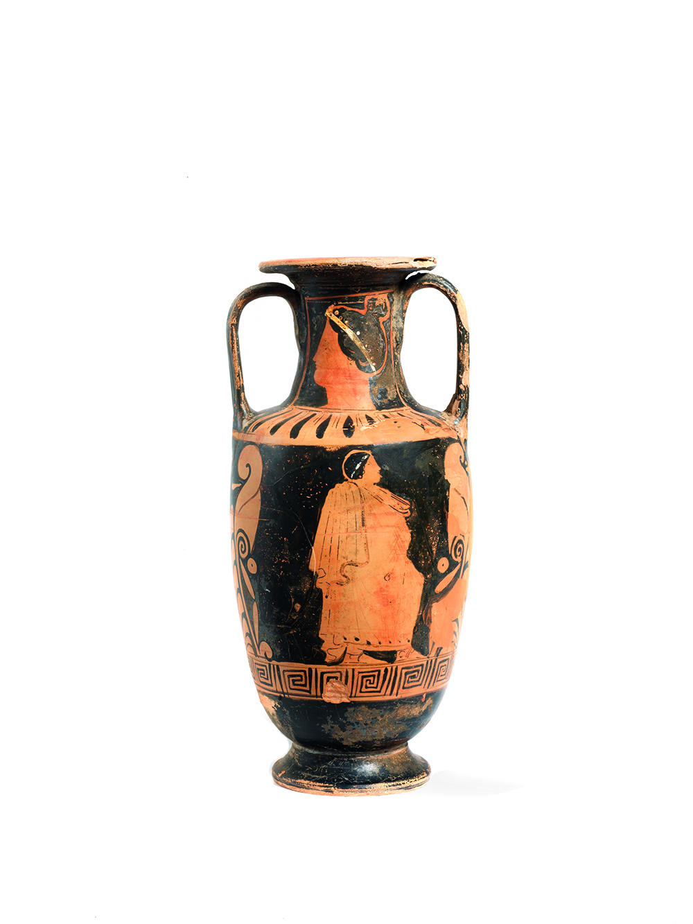 ANFORA CAMPANA A COLLO DISTINTO DATAZIONE: fine IV sec. a. C. MATERIA E TECNICA: argilla figulina rosata, vernice nera lucente, suddipinture in bianco e giallo, modellata a tornio veloce Labbro ad echino, alto collo cilindrico a profilo concavo, distinto dalla spalla arrotondata; corpo ovoide allungato verso il basso, piede ad echino modanato, anse a nastro costolate. DECORAZIONE ACCESSORIA: sul collo metopa con profilo femminile volto a destra con stephane radiata e collana di perle; sulla spalla linguette radiali; sotto le anse grandi palmette aperte a ventaglio fra girali e infiorescenze campanulate; sotto la scena figurata meandro interrotto destrorso; fondo del piede risparmiato DECORAZIONE: lato A) un giovane uomo nudo, seduto su un masso e volto a sinistra, con elmo conico e doppia lancia, in atteggiamento pensoso con un elegante himation ricamato che ricopre il masso su cui è seduto; lato B) efebo stante a sinistra, completamente avvolto nell’himation, drappeggiato in ampie pieghe dal quale fuoriescono solo la testa cinta da una tenia e i piedi calzati PRODUZIONE: ceramica campana, Paestum STATO DI CONSERVAZIONE: integralmente ricomposta da frammenti con alcune integrazioni DIMENSIONI: alt. cm 28; diam. bocca cm 9 CFR.: A. D.Trendall, Red figure Vases of South Italy and Sicily, London 1989, pp 198-205 PROVENIENZA: Bertolami Fine Arts, Roma