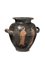 STAMNOS FALISCO A FIGURE ROSSE DATAZIONE: fine IV sec. a.C. MATERIA E TECNICA: argilla figulina rosata, vernice nera lucente, suddipinture in bianco, modellato a tornio veloce Orlo arrotondato ed estroflesso, collo cilindrico a profilo concavo, distinto dalla spalla appiattita, corpo ovoide rastremato inferiormente, piede ad anello, anse laterali a bastoncello ritorte verso l’alto ed impostate obliquamente sul ventre DECORAZIONE ACCESSORIA: sul collo tralcio di olivo orizzontale, sotto le anse grandi palmette a nove lobi aperte a ventaglio fra girali e volute desinenti in altre palmette, spazio fra le anse risparmiato, interno del piede verniciato in rosso DECORAZIONE: lati A e B uguali con scena di conversazione fra due efebi affrontati e completamente avvolti nei loro mantelli da cui fuoriescono solo le teste dai capelli mossi ed i piedi PRODUZIONE: ceramica falisca suddipinta STATO DI CONSERVAZIONE: ricomposto da frammenti con alcune integrazioni DIMENSIONI: alt. cm 28; diam. cm 17,5 PROVENIENZA: Bertolami Fine Arts, Roma