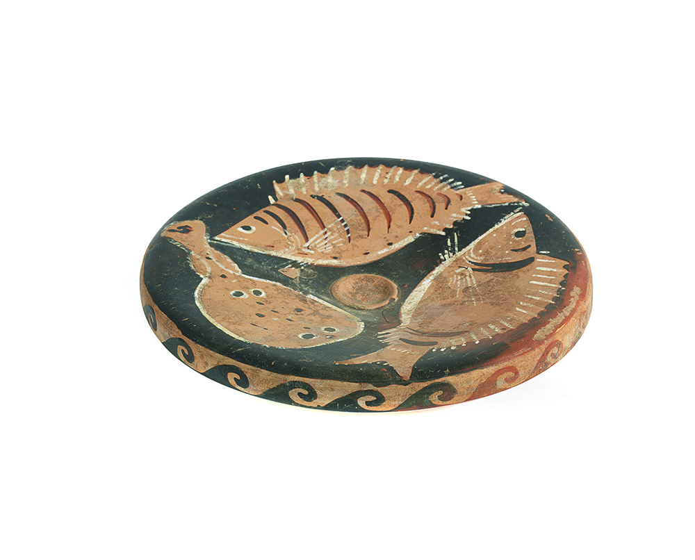PIATTO DA PESCE APULO DATAZIONE: fine IV sec. a.C. MATERIA E TECNICA: argilla figulina rosata, vernice bruno-nera opaca, suddipinture in bianco, modellato a tornio veloce Piatto con largo orlo pendulo, vasca troncoconica appiattita con tondello depresso al centro, breve piede a tromba DECORAZIONE: sul bordo meandro ad onda destrorso, nella vasca una razza chiodata, un sarago ed una mormora PRODUZIONE: ceramica apula a figure rosse STATO DI CONSERVAZIONE: integro DIMENSIONI: alt. cm 4; diam. cm 18,5