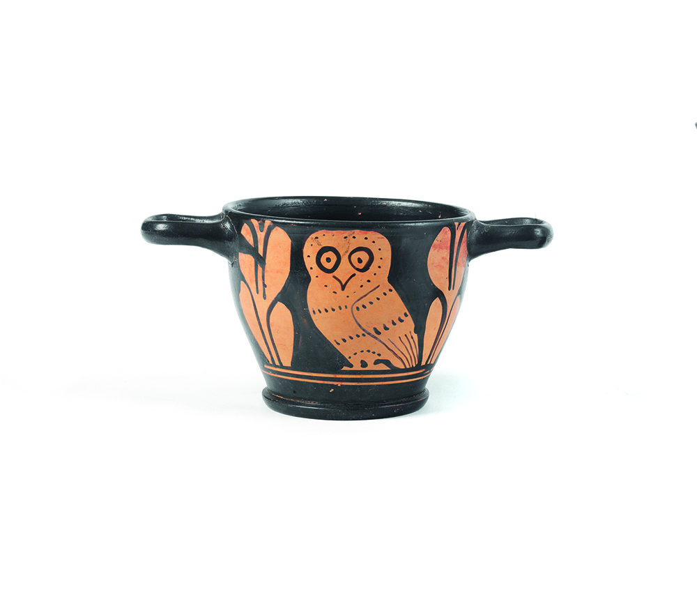 SKYPHOS APULO A FIGURE ROSSE DATAZIONE: IV sec. a.C. MATERIA E TECNICA: argilla figulina rosata, vernice nera lucente, coloritura arancio, modellato a tornio veloce Labbro appena estroflesso con orlo arrotondato, corpo ovoide rastremato verso il basso, piede ad anello, anse a nastro impostate orizzontalmente sotto l’orlo DECORAZIONE: su entrambi i lati civetta stante di tre quarti con le ali chiuse sul dorso e volta a destra, fra rami d’alloro verticali PRODUZIONE: ceramica apula a figure rosse STATO DI CONSERVAZIONE: integro DIMENSIONI: alt. cm 7,1; diam. bocca cm 9,2 PROVENIENZA: New Hermes Arte Antica, Arezzo