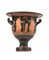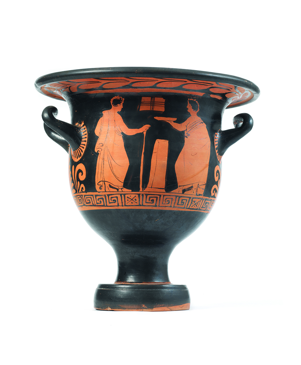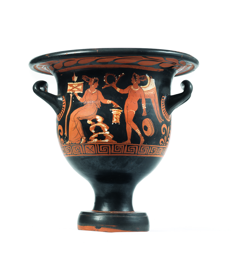 CRATERE A CAMPANA APULO DATAZIONE: 360-350. a. C. MATERIA E TECNICA: argilla figulina camoscio, vernice nera lucente, suddipinture in bianco e giallo, coloritura arancio; modellato a tornio veloce Labbro estroflesso distinto, con orlo arrotondato, corpo campaniforme, anse a bastoncello, impostate orizzontalmente e ritorte verso l’alto; piede a echino modanato DECORAZIONE ACCESSORIA: sotto il labbro tralcio orizzontale di foglie di olivo; sotto le anse palmetta aperta a ventaglio fra girali e volute, spazio fra le anse risparmiato, falsa baccellatura all’attacco delle anse; sotto le due scene figurate meandro sinistrorso interrotto da motivo a croce di Sant’Andrea DECORAZIONE: lato A) giovane erote androgino nudo stante e volto a destra, le grandi ali variopinte riunite sulla schiena, in atto di sollevare con la mano destra una ghirlanda, mentre tiene un cembalo nella sinistra; il giovane porta i capelli raccolti nel kekryphalos ricamato con un ciuffo vaporoso che ne sbuca fuori ed indossa orecchini con pendente collana a doppio filo di perle al collo ed alla gamba sinistra ed anche armille ai polsi ed alle caviglie; di fronte a lui si trova una giovane donna con un lungo chitone plissettato seduta a destra su una pila di sassi, in atto di sostenere con la destra una cista da cui pende una lunga tenia ricamata e con la sinistra una situla decorata; la donna è riccamente adornata con stephane radiata, orecchini, collana, armille e calzari; lato B) scena di conversazione: due giovani uomini ammantati in un lungo himation, da cui fuoriesce solo un braccio e parte del torace, si fronteggiano di fronte ad un’ara; uno si appoggia ad un bastone mentre l’altro tiene nella destra una patera per la libagione; nel campo un dittico incrociato (motivo firma del pittore) evoca l’ambiente della palestra STATO DI CONSERVAZIONE: integralmente ricomposto da frammenti PRODUZIONE: ceramica apula a figure rosse, Pittore dei Dittici Incrociati DIMENSIONI: alt. cm 29,5; diam. bocca cm 30 PROVENIENZA: New Hermes Arte Antica, Arezzo BIBLIOGRAFIA: A. D. Trendall, Red figure Vases of Apulia, London 1991, Supplemento II, p 94, n 14/36b Corredato di analisi di termoluminescenza effettuata in data 21 Maggio 1990 e di expertise scritta del Professor A. D. Trendall in data 23 Gennaio 1991