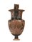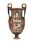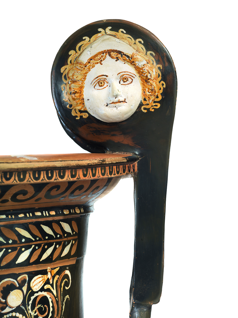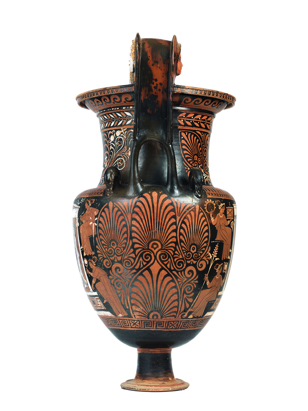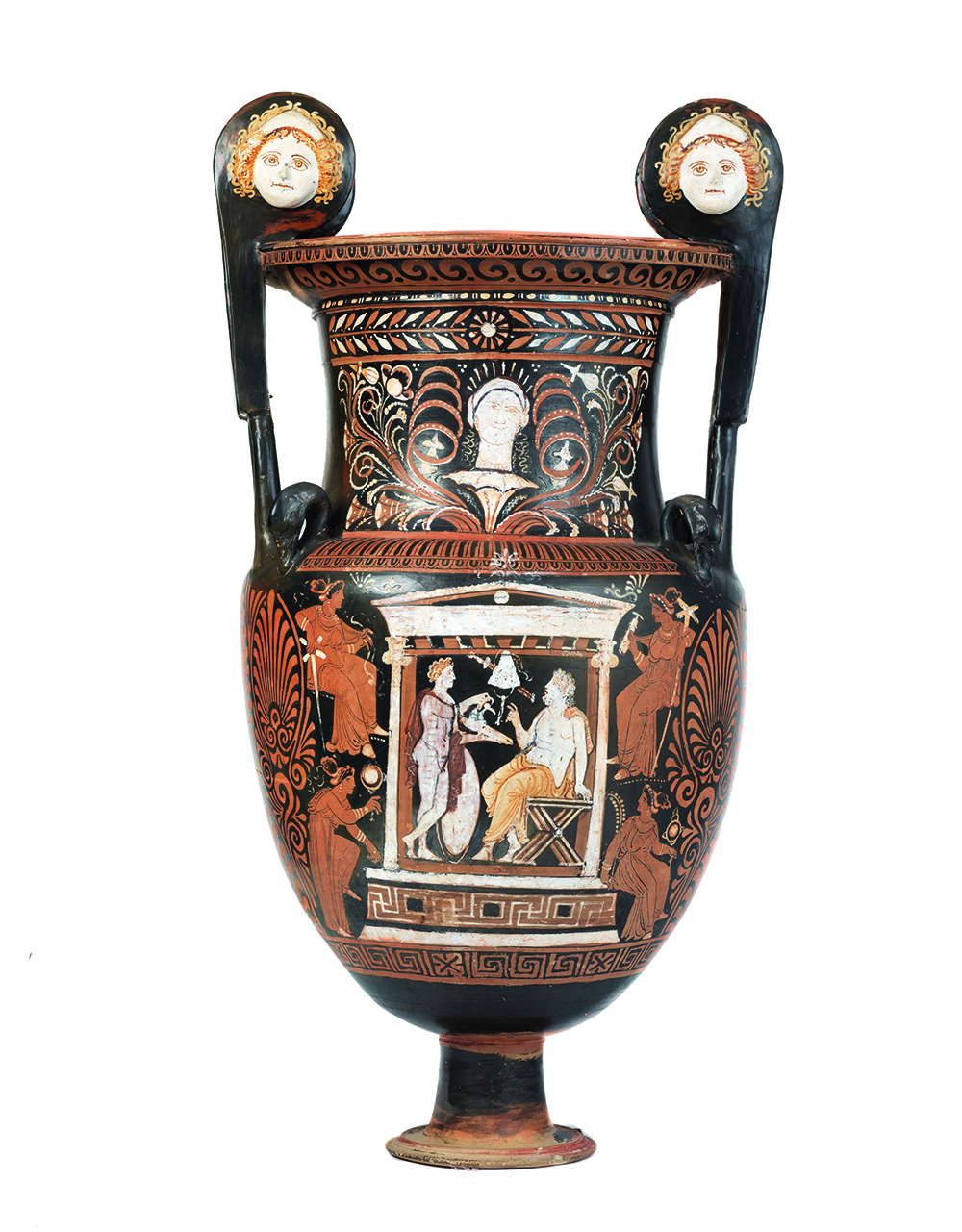 ECCEZIONALE CRATERE A VOLUTE DEL PITTORE DI BALTIMORA DATAZIONE: ultimo quarto del IV sec. a. C. MATERIA E TECNICA: argilla figulina camoscio, vernice nera lucente, coloritura arancio, suddipinture in bianco e giallo, modellato a tornio veloce e a stampo Labbro a tesa, con orlo ripiegato e concavo, collo cilindrico a profilo concavo distinto dalla spalla obliqua, grande corpo ovoide, alte anse a volute con margini rilevati impostate su una staffa verticale; lungo la costa verticale dell’ansa, in corrispondenza delle volute, foro circolare sul lato interno; volute racchiudenti due teste di Gorgone suddipinte in bianco da un lato e in rosso dall’altro, piede campanulato e scanalato al taglio; ai lati delle anse teste di cigno erette col becco appoggiato sulla spalla del vaso. DECORAZIONE ACCESSORIA: interno della bocca verniciato, labbro risparmiato; sull’orlo kyma ionico; sulla spalla falsa baccellatura, al di sotto delle scene figurate meandro sinistrorso interrotto da motivo a croce di sant’Andrea; sotto alle anse grande palmetta doppia e sovrapposta aperta a ventaglio, affiancata in alto da due altre palmette analoghe fra girali e volute DECORAZIONE: lato A) sotto il labbro meandro ad onda destrorso, sul collo grande rosetta centrata fra due rami di olivo orizzontali, cui segue un profilo femminile frontale con sakkos, stephane radiata, orecchini e collana con pendenti aurei che sorge da un fiore ed è circondato ricchissime volute e infiorescenze; sul ventre naiskos in bianco con colonne ioniche ed alti acroteri a palmetta, con le travi del soffitto viste in prospettiva, sotto al quale si trova la figura del defunto, in nudità eroica, seduto a destra sul suo mantello appoggiato ad uno sgabello a gambe incrociate; l’uomo è raffigurato in età matura con folta capigliatura ricciuta e barba, la mano destra appoggiata allo sgabello, la sinistra sollevata verso un giovane scudiero che, in piedi davanti a lui, nudo col solo mantello drappeggiato sulle spalle è in atto di offrire una libazione al defunto tenendo un’oinochoe ed un bacile; in alto sono appese la spada ed un elmo conico, accanto allo scudiero un grande scudo circolare; ai lati del tempietto si trovano in doppio registro, due donne da ciascun lato, tutte sedute e riccamente abbigliate, volte verso il defunto tenendo in mano fiaccole a croce, tenie, specchi ed un alabastron che si riferiscono ai riti funebri; lato B) sotto il labbro meandro ad onda destrorso, sul collo grande rosetta centrata fra due rami di olivo orizzontali, cui segue un profilo femminile volto a destra con sakkos, stephane radiata, orecchini e collana a doppio filo di perle che sorge da un fiore ed è circondato da grandi volute e infiorescenze sotto al labbro meandro ad onda destrorso; sul collo tralcio orizzontale di alloro e grande palmetta aperta a ventaglio fra volute; sul ventre si trova un naiskos contenente una grande infiorescenza doppia, ai lati come nell’altro lato quattro donne sedute su due registri: quelle in alto con una cista, una ghirlanda ed una grande foglia d’edera cuoriforme, quelle in basso con un tirso fiorito ed uno specchio PRODUZIONE: ceramica apula a figure rosse, Pittore di Baltimora STATO DI CONSERVAZIONE: integralmente ricomposto da pochi frammenti, senza integrazioni DIMENSIONI: alt. cm 79, diam. bocca cm 37,4 PROVENIENZA: Archeopterix Lithographica, Arezzo BIBL.: A.D. Trendall, The Red-figured Vases of Apulia, London 1991, Supplemento II, n. 27/11 c Corredato da analisi di termoluminescenza effettuata in data 21-05-1990 e da expertise del Professor A. D. Trendall che conferma l’attribuzione al Pittore di Baltimora e lo definisce “….. magnifico cratere a volute del P. di Baltimora. E’ un bellissimo pezzo nel caratteristico stile del pittore.”