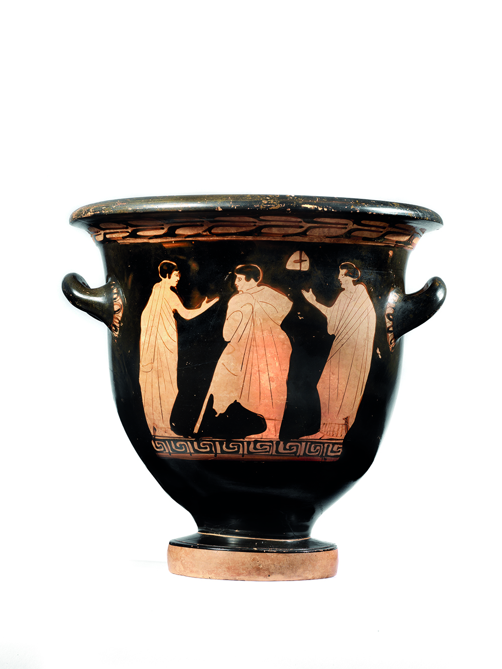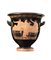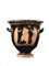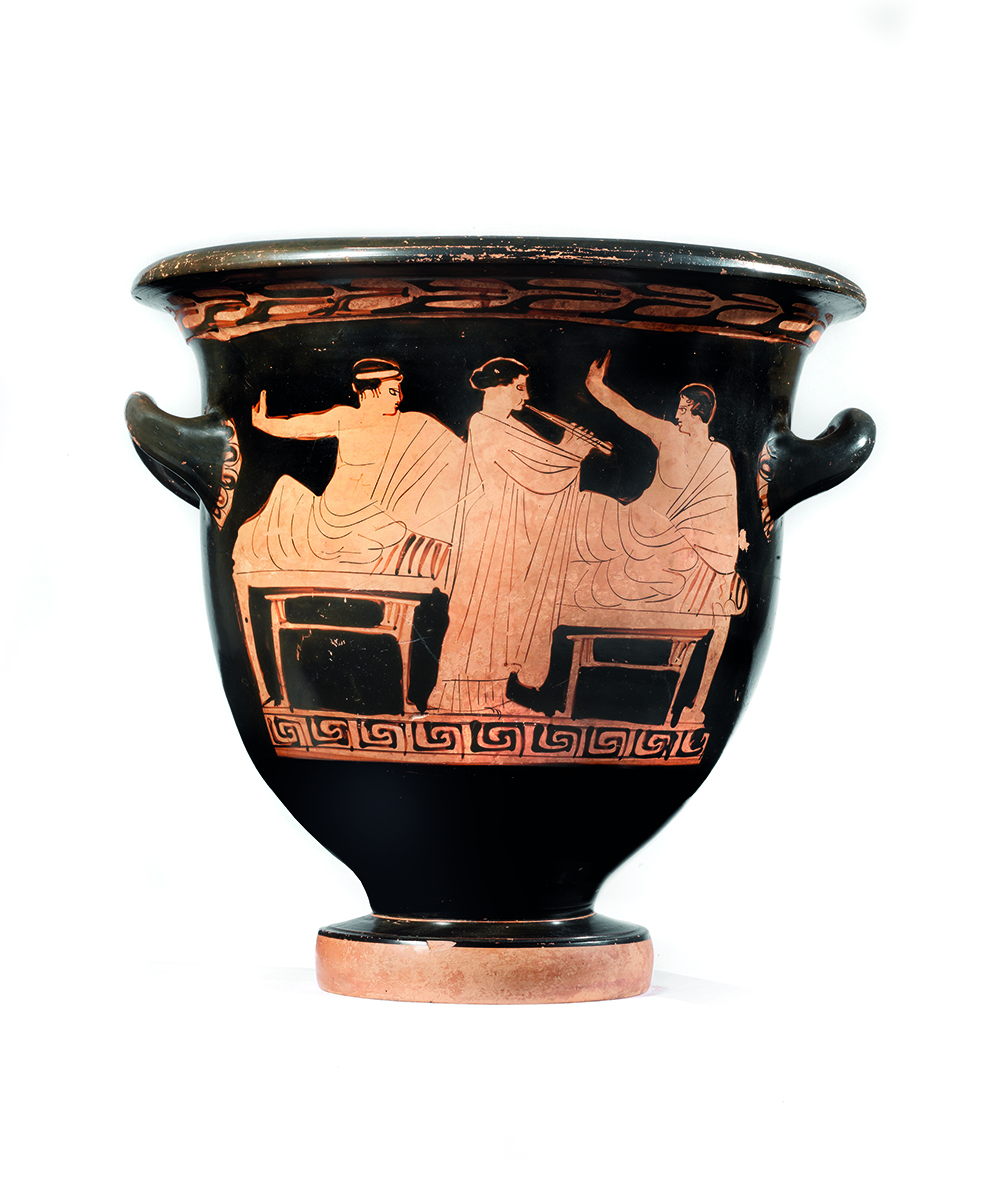 CRATERE A CAMPANA ATTICO DATAZIONE: ultimo quarto V sec. a. C. MATERIA E TECNICA: argilla figulina arancio, vernice nera lucente, modellato a tornio veloce Labbro estroflesso distinto, con orlo arrotondato, corpo campaniforme, anse a bastoncello, impostate orizzontalmente e ritorte verso l’alto; piede a echino modanato DECORAZIONE ACCESSORIA: sotto il labbro tralcio orizzontale di foglie di olivo; spazio fra le anse risparmiato, falsa baccellatura all’attacco delle anse; sotto le due scene figurate meandro interrotto sinistrorso DECORAZIONE: lato A) scena di banchetto con due giovani semisdraiati a destra su due klinai, entrambi appoggiati ad un cuscino col braccio sinistro, il braccio destro sollevato, il torace scoperto ed il mantello che gli cade dalla spalla sinistra e copre le gambe; sotto le klinai si trovano due tavolini bassi ed in mezzo una figura di suonatrice di doppio flauto, avvolta nel mantello che copre il chitone plissettato e volta a sinistra; lato B) scena di conversazione in palestra: due giovani uomini ammantati in un lungo himation, da cui fuoriesce solo un braccio e parte del torace, con una tenia nei capelli, sono rivolti verso un terzo giovane abbigliato in modo analogo che si appoggia ad un bastone; nel campo una coppia di halteres evoca l’ambiente della palestra STATO DI CONSERVAZIONE: integro PRODUZIONE: ceramica attica a figure rosse DIMENSIONI: alt. cm 29, diam. bocca cm 29,8 PROVENIENZA: Archeopterix Lithographica, Arezzo CFR.: J. D. Beazley Attic Red-figure Vase-painters I, Londra 1963, pp. 522- 528