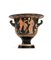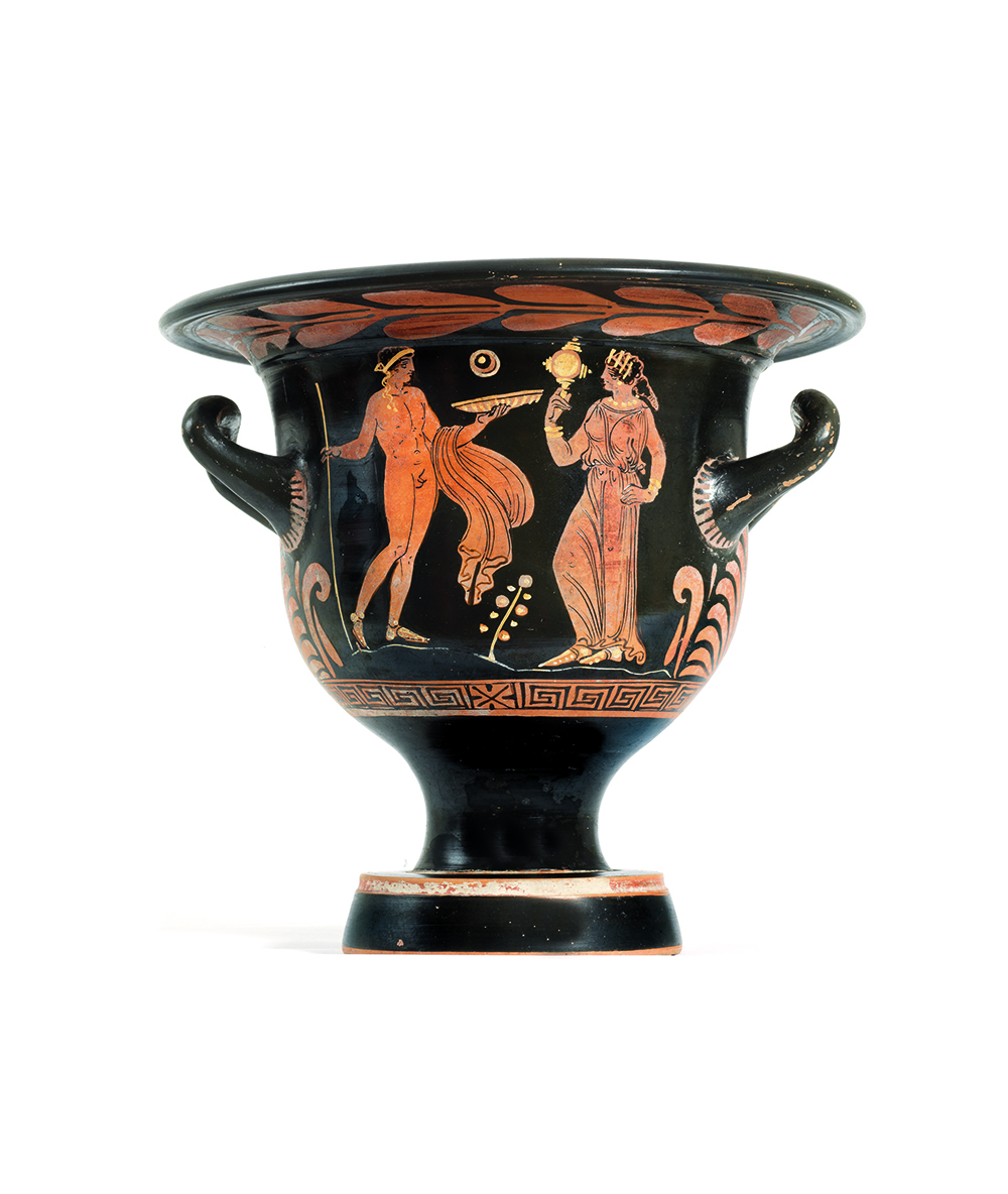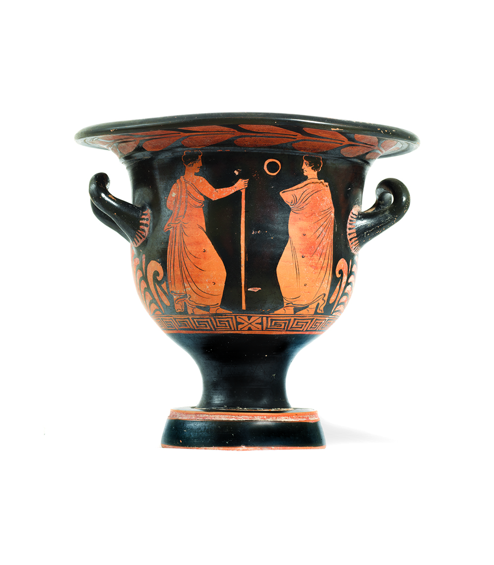 CRATERE A CAMPANA APULO DATAZIONE: 360-350 a. C. MATERIA E TECNICA: argilla figulina camoscio, vernice nera lucente, suddipinture in bianco e giallo, coloritura arancio; modellato a tornio veloce Labbro estroflesso distinto, con orlo arrotondato, corpo campaniforme, anse a bastoncello, impostate orizzontalmente e ritorte verso l’alto; piede a echino modanato DECORAZIONE ACCESSORIA: sotto il labbro tralcio orizzontale di foglie di olivo; sotto le anse palmetta, aperta a ventaglio fra girali e volute, spazio fra le anse risparmiato, falsa baccellatura all’attacco delle anse; sotto le due scene figurate meandro sinistrorso interrotto da motivo a croce di Sant’Andrea DECORAZIONE: lato A) giovane uomo nudo, col mantello ripiegato sul braccio sinistro, stante di tre quarti a sinistra con una tenia nei capelli, un tirso nella mano destra, in atto di offrire una phiale baccellata ad una giovane donna con un lungo chitone plissettato, stante a destra, con la mano sinistra sul fianco e l’altra sollevata a reggere uno specchio; la donna è riccamente adornata con stephane radiata, orecchini, collana e armille in oro e porta i calzari; nel campo motivi fitomorfi ad indicare l’ambientazione all’aperto; lato B) scena di conversazione in palestra fra due giovani uomini ammantati in un lungo himation, da cui fuoriesce solo un braccio e parte del torace; STATO DI CONSERVAZIONE: integro, bella vernice lucente PRODUZIONE: ceramica apula a figure rosse, Pittore Vaticano 14 DIMENSIONI: alt. cm 27; diam. bocca cm 26,5 CFR.: A.D.Trendall, Red-figured Vases of South Italy and Sicily, London 1989, p.81, n.152-153