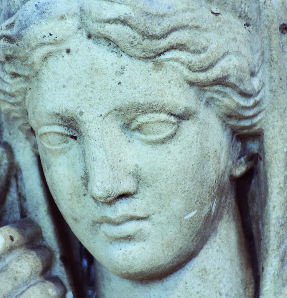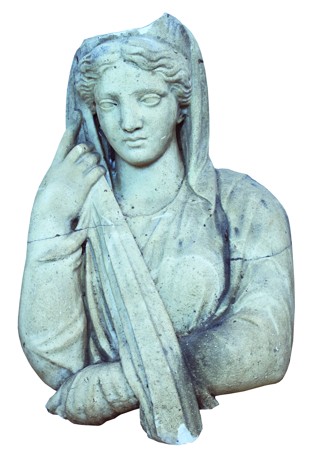 FIGURA FEMMINILE VELATA DATAZIONE: I-II sec. d. C. MATERIA E TECNICA: marmo bianco a grana fine, scolpito e levigato Giovane donna dall’aria assorta, raffigurata mentre si acconcia con grazia il mantello su i capelli con la mano destra, mentre l’altro braccio è ripiegato sul torace. La fanciulla ha i capelli ondulati che incorniciano il volto e la fronte larga, arcate orbitali chiaroscurate ed occhi allungati con le palpebre ben evidenziate; il volto è regolare ed il naso rettilineo, la bocca piccola dalle labbra carnose, il mento tondeggiante. Sotto al chitone drappeggiato in pieghe cannellate si indovinano i seni. La fanciulla, nonostante la frammentarietà mostra un’espressione delicata con lo sguardo perso verso l’infinito PRODUZIONE: cultura romana imperiale STATO DI CONSERVAZIONE: lacunoso, priva degli arti inferiori e con una frattura alla sommità della testa DIMENSIONI: alt. cm 48