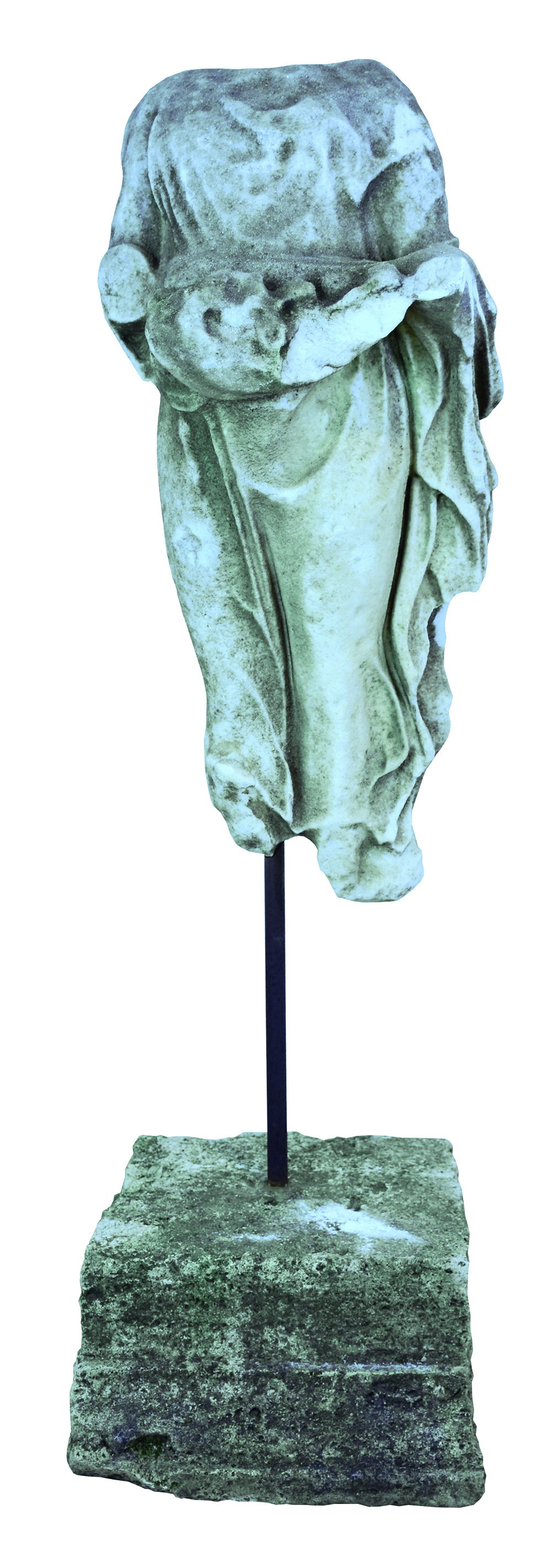OFFERENTE DATAZIONE: I-II sec. d. C. MATERIA E TECNICA: marmo bianco a grana fine, scolpito e levigato Torso femminile pertinente ad una figura gradiente con chitone a fitte pieghe cannellate che si apre nel movimento; la donna è raffigurata con le braccia sollevate all’altezza dell’addome, nell’atto di porgere alcuni frutti come offerta alla divinità PRODUZIONE: cultura romana imperiale STATO DI CONSERVAZIONE: lacunoso, priva della testa, degli avambracci e della parte inferiore delle gambe DIMENSIONI: alt. cm 64