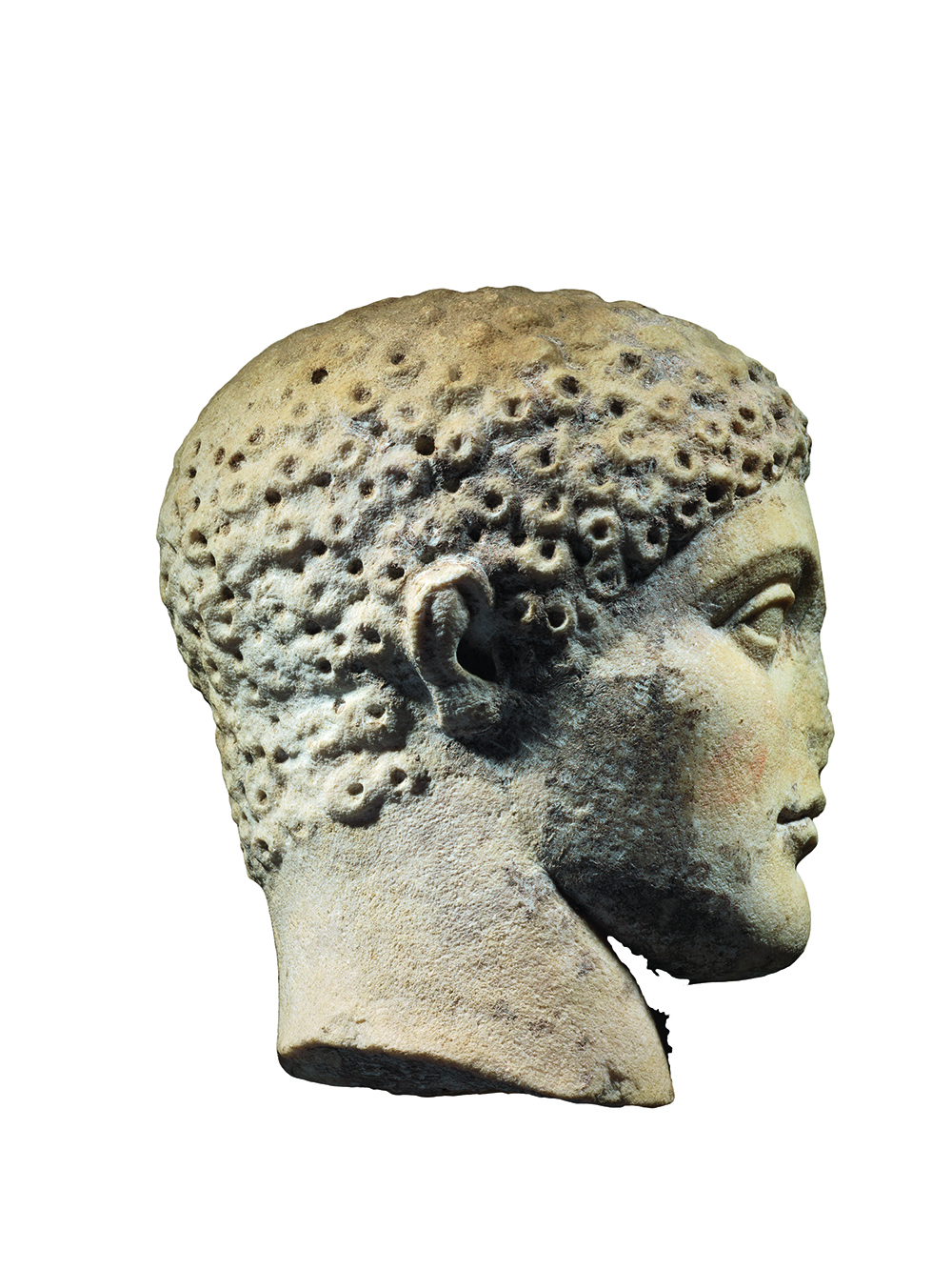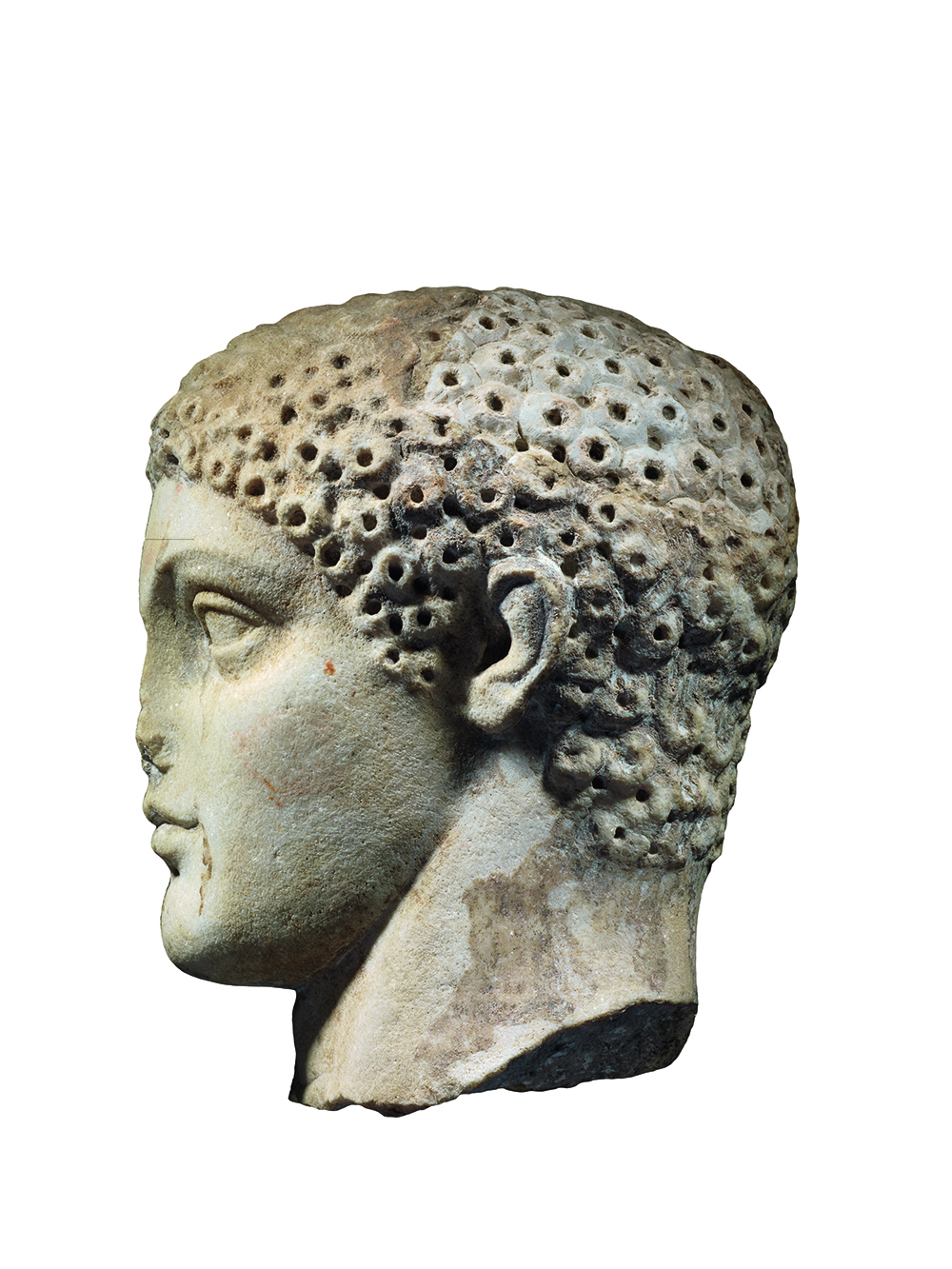 HARMODIOS DATAZIONE: II sec. d. C. MATERIA E TECNICA: marmo bianco greco a grana media, scolpito, levigato e rifinito a trapano, tracce di colore rosso PRODUZIONE: cultura romana imperiale STATO DI CONSERVAZIONE: superficie leggermente abrasa, naso scheggiato, un restauro antico sulla calotta cranica con marmo italico DIMENSIONI: alt. cm 29,5 Corredato di certificato di avvenuta spedizione in data 16.05.2018