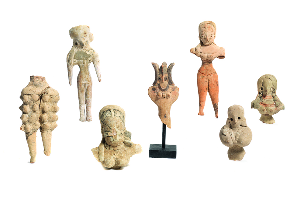 SETTE STATUETTE MERGHAR DATAZIONE: III millennio a.C. MATERIA E TECNICA: argilla depurata rossiccia e avorio, vernice rossa, modellate a mano Statuetta maschile nuda con alta acconciatura e testa stilizzata con becco d’uccello, braccia distese lungo i fianchi, indicazione del sesso, statuetta femminile di Dea Madre, con corona in posizione stante; cinque statuette frammentarie stanti raffiguranti la Dea Madre nuda con collane, teste stilizzate con becchi di uccello, elaborata acconciatura, grandi seni e con braccia protese e parte inferiore di statuetta con pantaloni con bugne coniche (7) PRODUZIONE: cultura di Mehrgar, Valle dell’Indo, Baluchistan, Pakistan STATO DI CONSERVAZIONE: due quasi integre, le altre prive della parte inferiore del corpo DIMENSIONI: alt. da cm 12 a cm 5,5 PROVENIENZA: Studio Arga, di Gabriela Tallon, Venezia CFR.: C. Jarrige, Les figurines humaines au Baluchistanin Le cités oublièes de l’Indus, Paris 1988 p. 87, figg. 40-41; BIBL.: G. Ligabue e G. Rossi Osmida, Animali e mito nel vicino oriente antico, Trebaseleghe (PD) 2008, p. 184