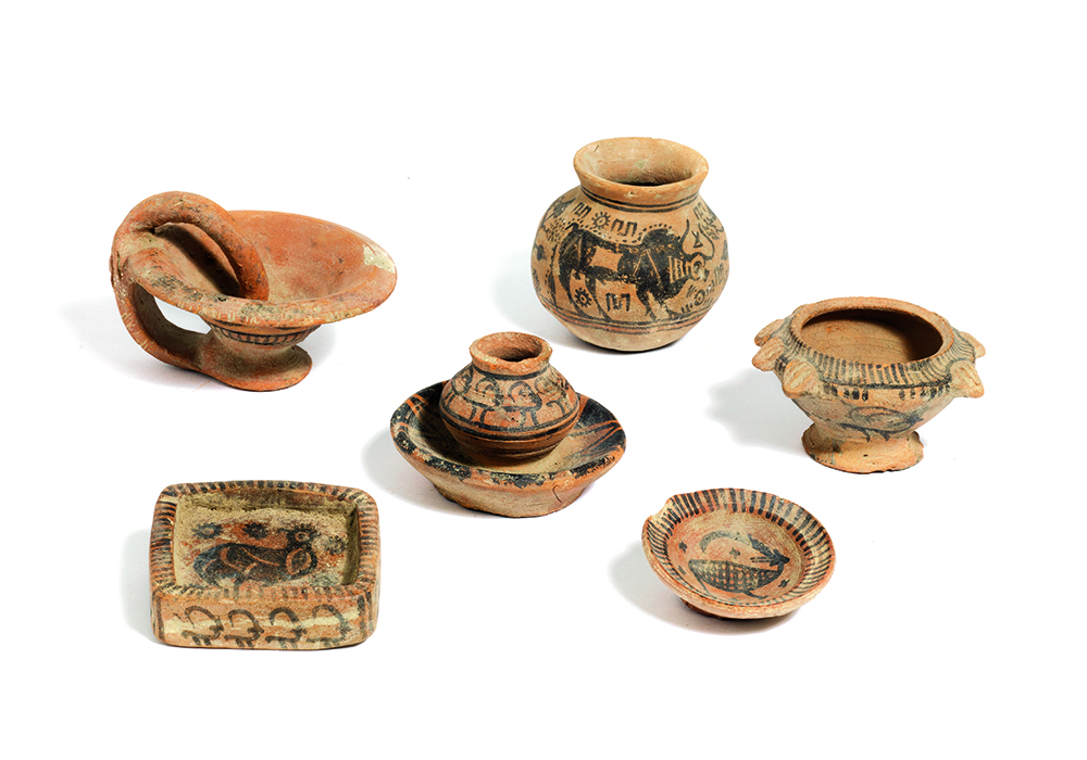 SEI VASETTI KULLI DATAZIONE: 2.500-1.900 a.C. MATERIA E TECNICA: argilla rosata, ingubbiatura rossiccia, vernice bruna, modellate a tornio veloce Olletta con labbro estroflesso, corpo globulare, fondo piatto, decorata con bovidi gradienti a destra e riempitivi fitomorfi e geometrici; olletta analoga alla precedente ma con piattello unito alla base decorata con teoria di capridi dalle lunghe corna; olletta troncoconica decorata da apofisi coniche e capridi dalle lunghe corna; tazza monoansata troncoconica con ansa sormontante e rientrante nella vasca decorata con serpente; coppetta e piattello quadrangolare decorati con capridi e volatile (6) PRODUZIONE: cultura Kulli, Nindowari, Baluchistan, Pakistan STATO DI CONSERVAZIONE: integri DIMENSIONI: alt. da cm 8 a cm 2