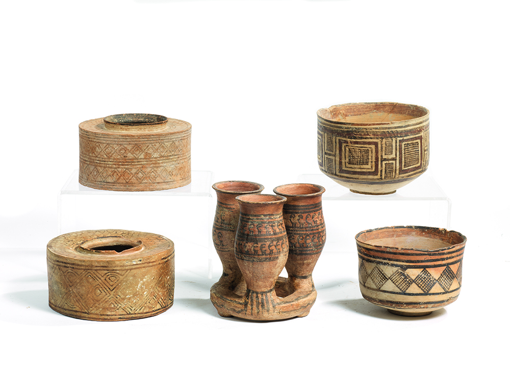 CINQUE VASI KULLI DATAZIONE: 2500-1.900 a. C. MATERIA E TECNICA: argilla rosata, ingubbiatura camoscio, vernice bruna e rossa, modellati a tornio veloce Vaso costituito da tre contenitori fusiformi decorati sul ventre con teorie di capridi gradienti, su base circolare decorata a motivi fitomorfi; due pissidi cilindriche con orlo a colletto e fondo piatto; decorate in bruno con motivi geometrici; due coppe di forma troncoconica con piede ad anello decorate sul ventre a motivi geometrici con teoria di rombi e quadrati campiti a fitto reticolo fra gruppi di linee parallele orizzontali (5) PRODUZIONE: cultura Kulli, Nindowari, Baluchistan, Pakistan STATO DI CONSERVAZIONE: integri, ad eccezione di un piccolo restauro su una pisside DIMENSIONI: alt. da cm 14 a cm 8 PROVENIENZA: Casa d’Aste Pandolfini, Firenze CFR.: G. Ligabue e G. Rossi Osmida, Animali e mito nel Vicino Oriente Antico, Padova 2008, p. 160, fig. 1.; Catalogo della mostra: Les cites oublies de l’indus, Association Francaise d’Action Artistique, Paris 1988 n.121