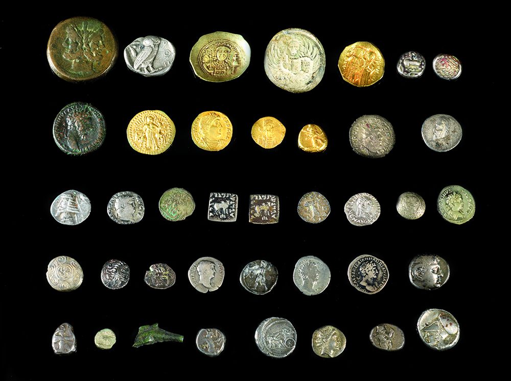 LOTTO DI TRENTANOVE MONETE ORO Impero persiano, darico d’oro, Artaserse I, 455-420 a.C., gr 8,5, cons. BB India, dinaro d’oro, Vasudeva I, 164-200 d.C., gr 7,7, cons. SPL Impero d’Oriente, solido d’oro, Valente, 364-368 d.C., gr. 4, cons. SPL Bisanzio, tremisse, zecca di Costantinopoli, Costantino IV, 668-685 d.C., gr. 1,4, cons. B Bisanzio, solido scodellato, Giovanni III, 1222-1223, gr. 4,3, cons. SPL Bisanzio, stamenon, Michele VII, 1071-1078, gr. 4,3, cons. BB ARGENTO Atene, tetradracma, 450 a.C. ca, gr. 15,5, con B Tracia, Istros, un quarto di statere, 400-350 a.C., gr,. 1,5, cons. B Cirene, didracma, V-IV sec. a.C., gr. 7,6, cons. BB Impero persiano, tre sigli, V-IV sec. a.C., gr 16,7, cons. BB Sidone, shekel, Ba’lshallin II, 385-372 a.C., gr. 6,9, cons. B Akarnania, statere, 300-250 a.C., gr. 8,4, cons. BB Gallia Cisalpina, due dracme, imitazione del tipo massaliota, III sec. a.C., gr. 6,2, cons. B Macedonia, dracma, Demetrio Poliorcete, 298-295 a.C., gr. 4,1, cons. SPL Macedonia, dracma, 168 a.C. gr. 3,6 cons. SPL Eubea, Histiae, tetrobolo, 196-146 a.C., gr, 2,5, cons. SPL Regno indo-greco, dracma, Menandro I, 165-130 a.C., gr. 2,3, cons. BB Regno indo-greco, dracma, Eucratide I, 170-145 a.C., gr. 1,4, cons. B Regno indo-greco, Apollodoto I, 180-160 a.C., gr. 1,6 e 1,9, cons. BB Regno Partico, dracma, Mitridate II, 124-88 a.C. gr. 3,5 cons. BB Regno Partico, dracma, Fraate IV, 37-2 a.C., gr. 2,7 cons. BB Regno indo-greco, moneta scodellata, gr. 1,8, cons. B Moneta islamica, gr. 1,4, cons. B Due dracme celti del Danubio, II sec.a.C. gr. 3,8 e 4,4, cons. BB Roma, denario, Nerone, 54-68 d.C., gr. 2,9, cons. BB Roma, denario, Adriano, 117-138 d.C., gr. 2,9, cons. BB Roma, denario, Adriano, 117-138 d.C., gr. 2,8, cons. B Roma, denario, Antonino, Pio, 138-161 d.C., gr. 2,8, cons. B Roma, denario, Caracalla, 198-209 d.C. gr. 3,2, cons. BB Gallia, antoniniano, Postumo, 260-269 d.C., gr. 3,7, cons. BB BRONZO Sarmazia, Olbia, moneta in forma di delfino, V sec. a.C., gr. 1,7 Roma, sestante, III a.C., gr. 50, cons. B Roma, asse, Marco Aurelio (161-180 d.C.), 168 d.C., gr. 12,2, cons. SPL PIOMBO Venezia, sigillo con leone alato di San Marco, XIII sec. PROVENIENZA: Casa d’Aste Pandolfini, Firenze