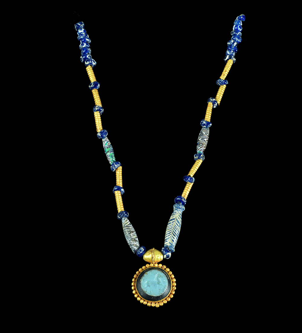 IMPORTANTE COLLANA ROMANA DATAZIONE: III sec. d. C. MATERIA E TECNICA: pasta vitrea colorata azzurra e bianca, lamina d’oro sbalzata Collana composta da vaghi in pasta vitrea murrina ad occhi, dieci vaghi tubulari in lamina d’oro ed un medaglione centrale in lamina d’oro con una pasta vitrea circolare ad imitazione del calcedonio, incisa con un cavallo gradiente a sinistra PRODUZIONE: cultura tardo romana del Libano STATO DI CONSERVAZIONE: integra DIMENSIONI: lungh. cm 36 PROVENIENZA: Casa d’Aste Pandolfini, Firenze