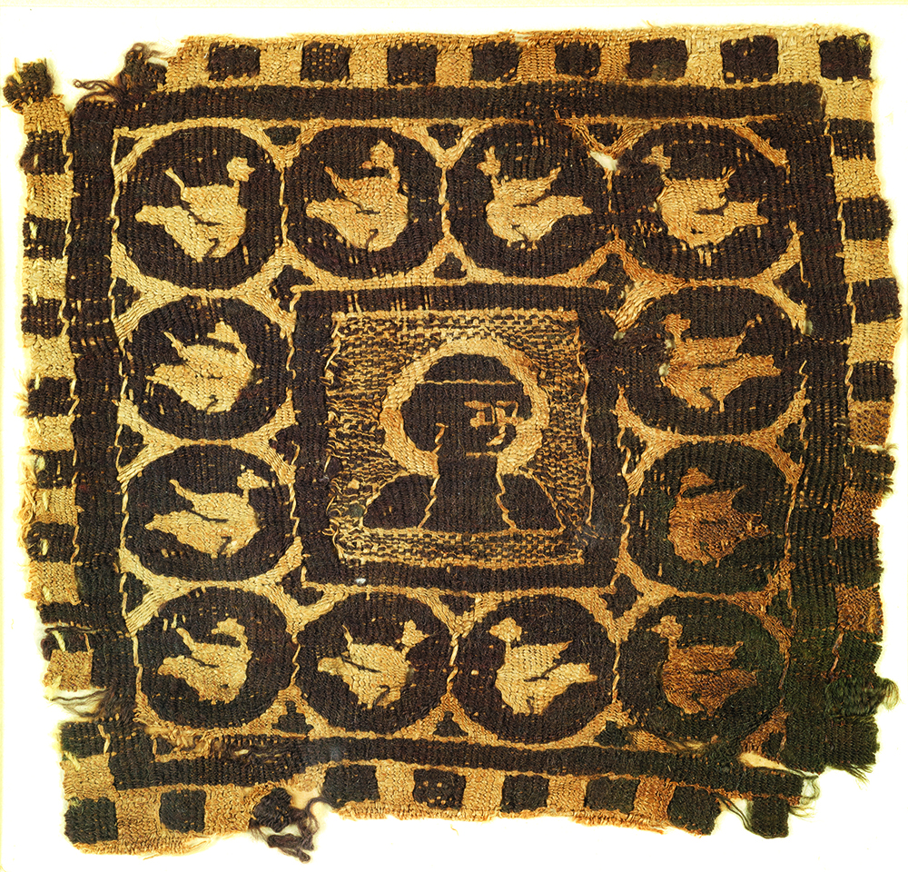 TABULA DATAZIONE: IV-VI sec. d. C. MATERIA E TECNICA: lino colorato tessuto Tabula pertinente alla parte anteriore di una tunica copta, raffigurante un busto maschile drappeggiato e leggermente volto a sinistra, con folta capigliatura, sopracciglia in evidenza e grandi occhi entro cornice di uccelli acquatici stilizzati PRODUZIONE: cultura copta egiziana STATO DI CONSERVAZIONE: integra DIMENSIONI: cm 19x18 PROVENIENZA: Casa d’Aste Pandolfini, Firenze