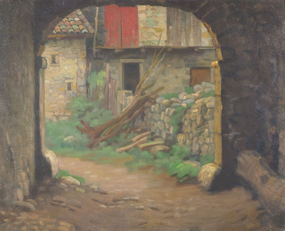 Pietro Lucano Trieste 1878-1972 "Case a Meduno" cm. 40x50 - olio su cartone Firmato b. a d. AL retro titolo, firma e numero 756.