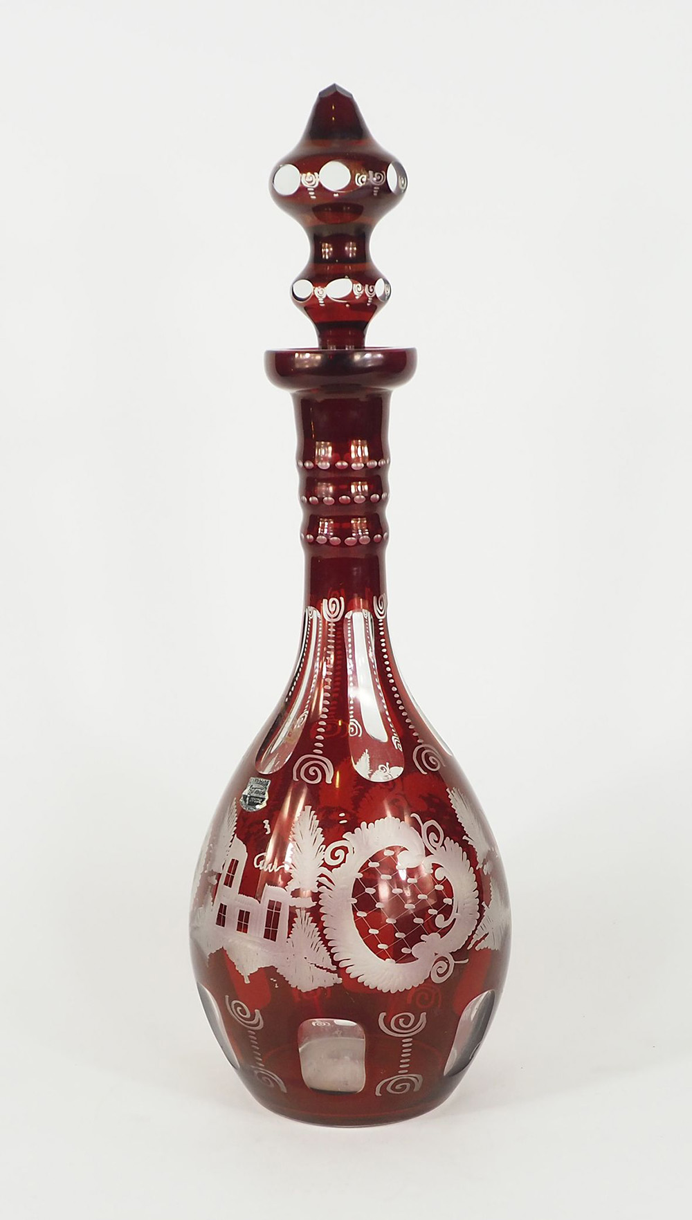 Grande bottiglia in cristallo incamiciato rosso con decori di paesaggio, con tappo. H. tot cm. 51.