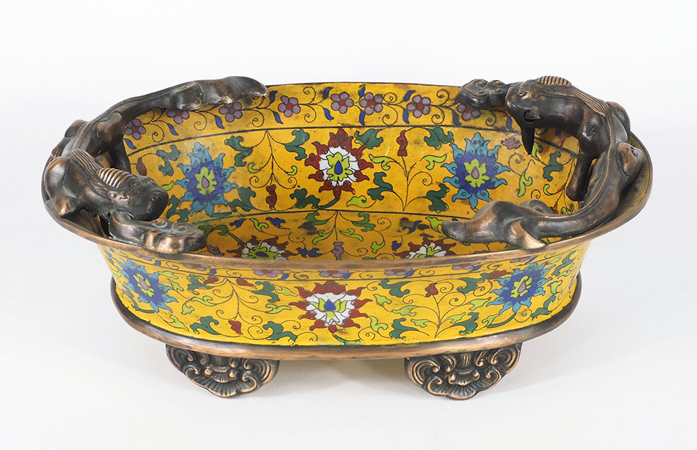Centrotavola ovale in bronzo a lavorazione cloisonnè. cm. 35x24.