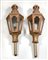 Coppia di fanali in ferro dipinto rosso, su pali in legno dipinto.