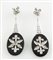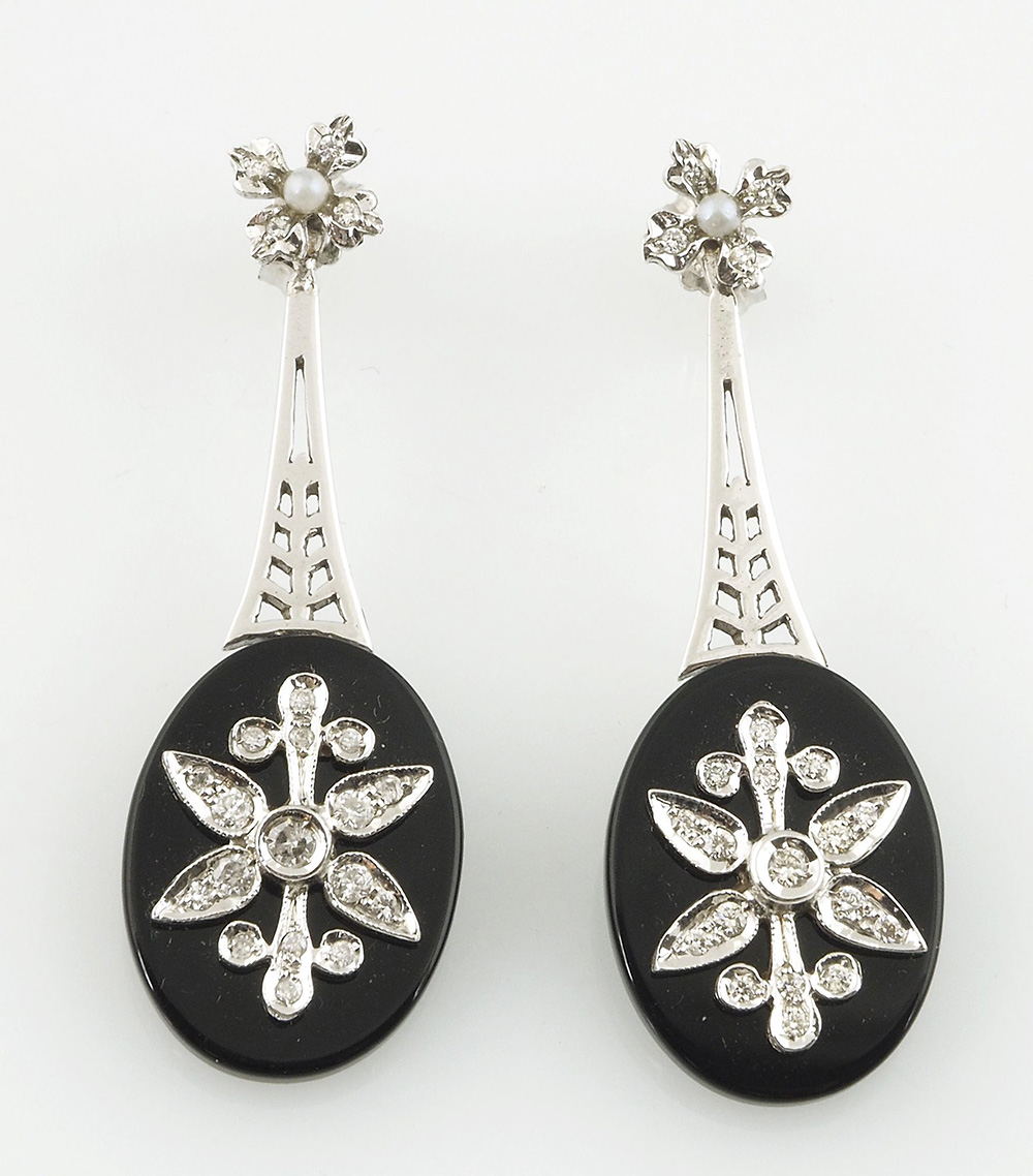 Orecchini pendenti in oro bianco con finale forma ovale in onice con applicazioni floreali in oro bianco e diamantini